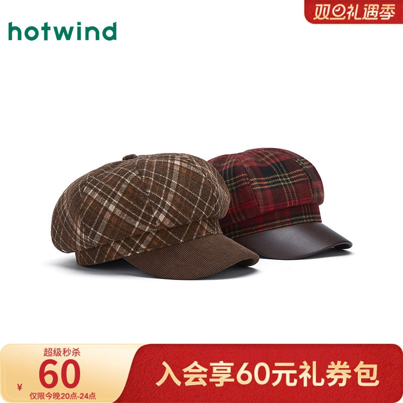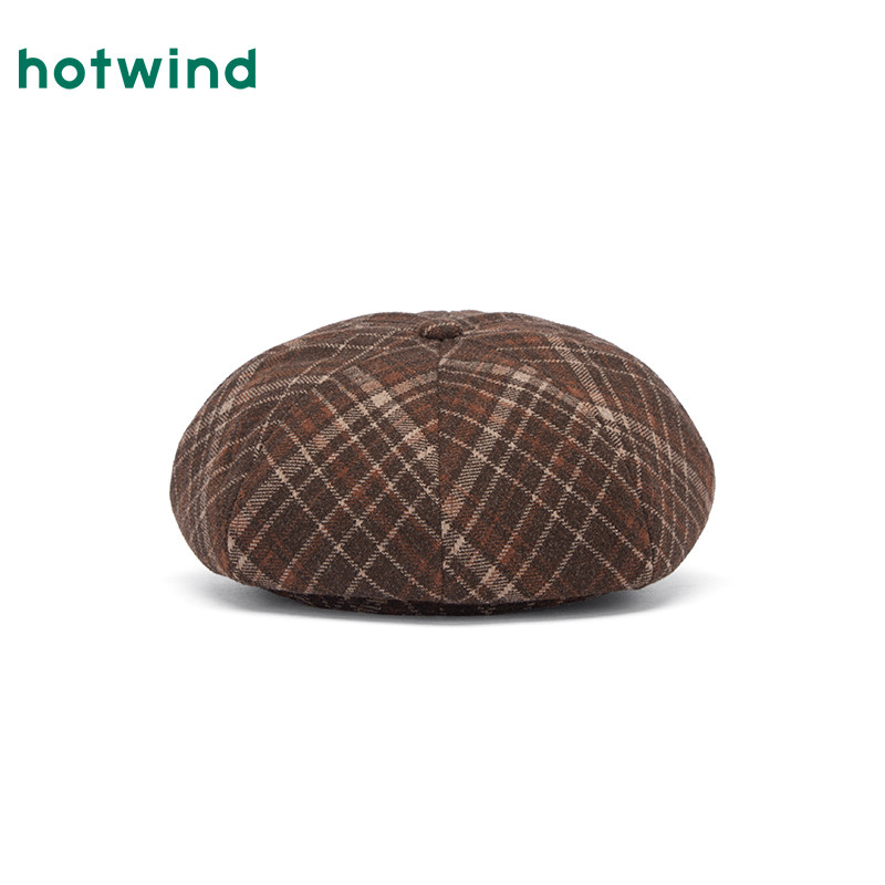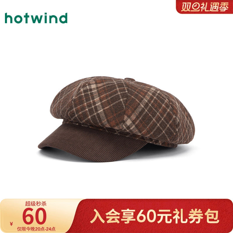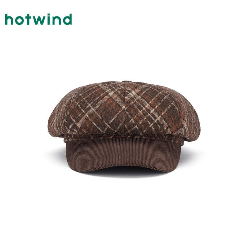 热风女士帽子格纹八角帽2025年冬季新款拼接复古显脸小八角鸭舌帽
