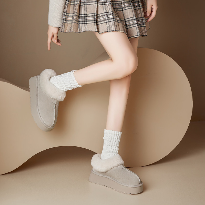 miu家厚底雪地靴女冬季真皮短靴羊毛侧拉链增高厚底加绒毛毛棉鞋