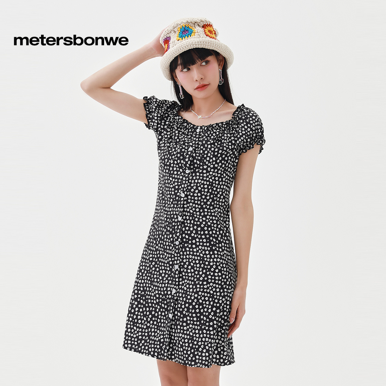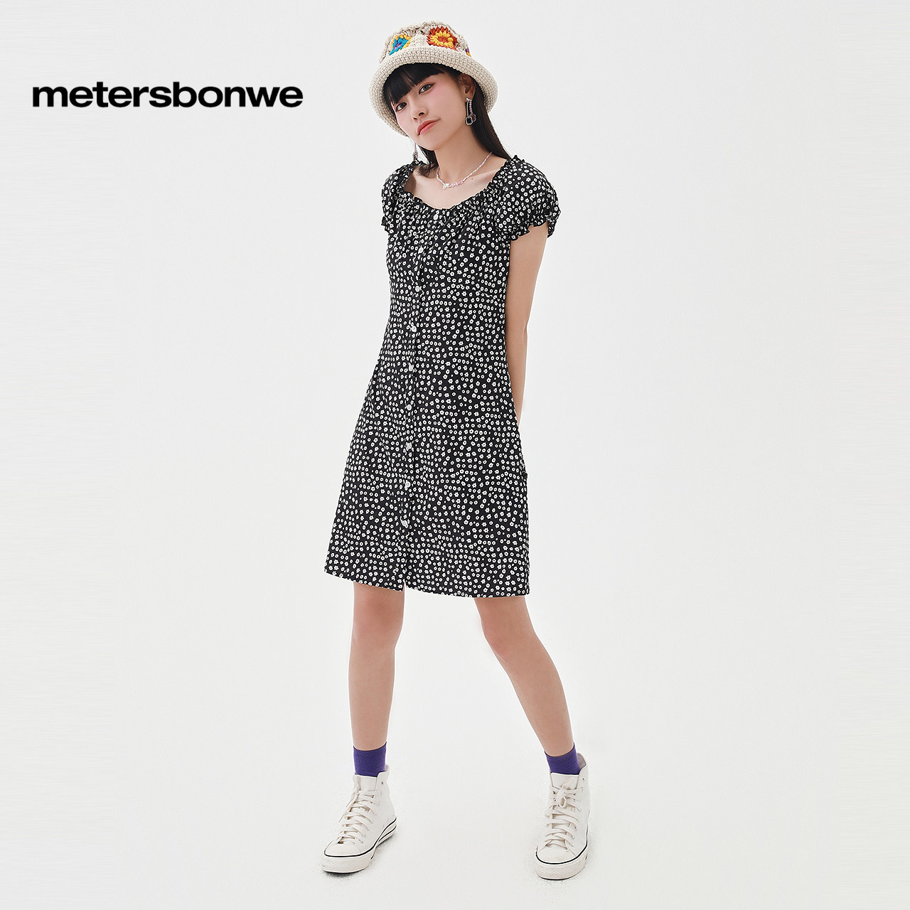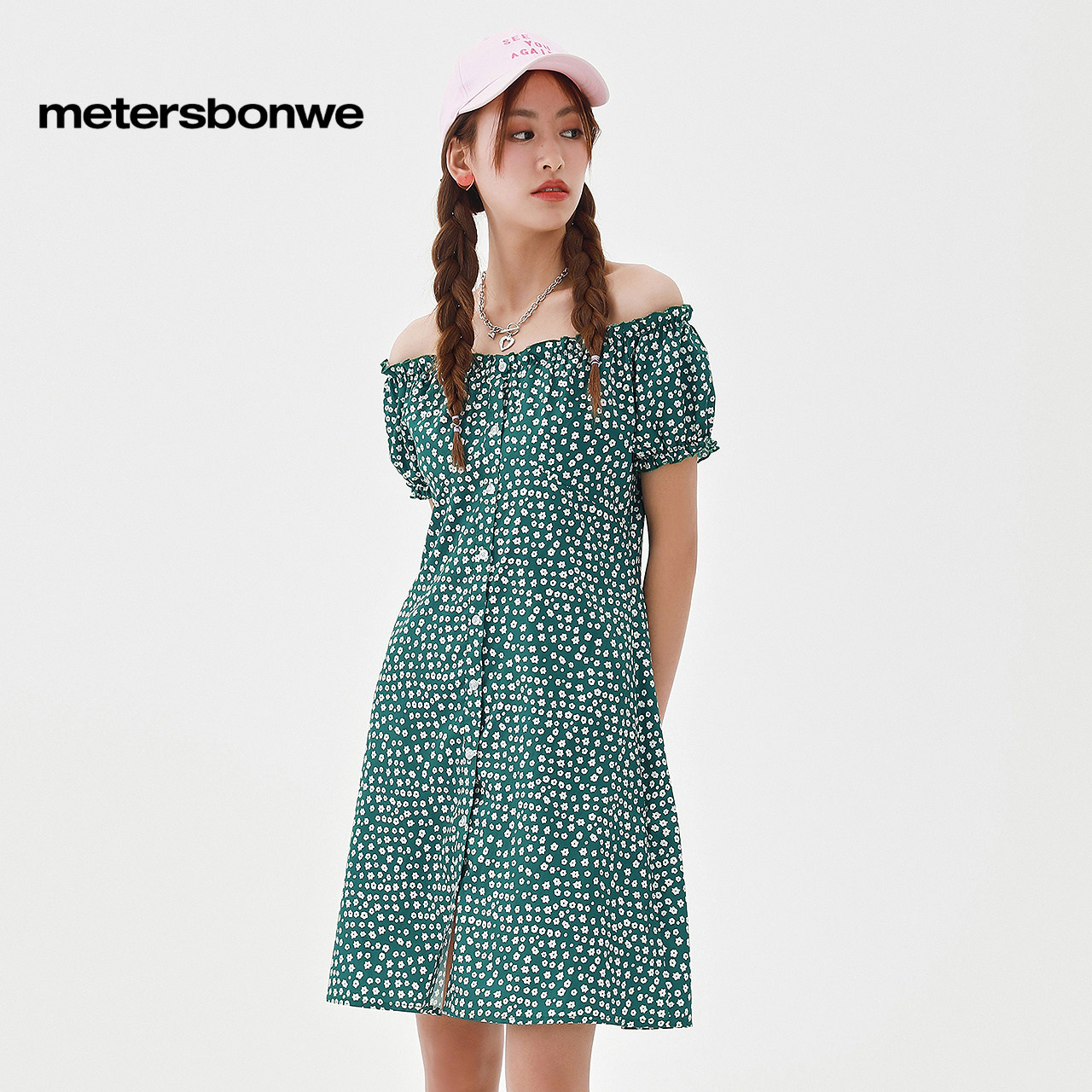 美特斯邦威纯棉连衣裙女春秋ins松紧花边领袖露肩轻薄舒适碎花裙