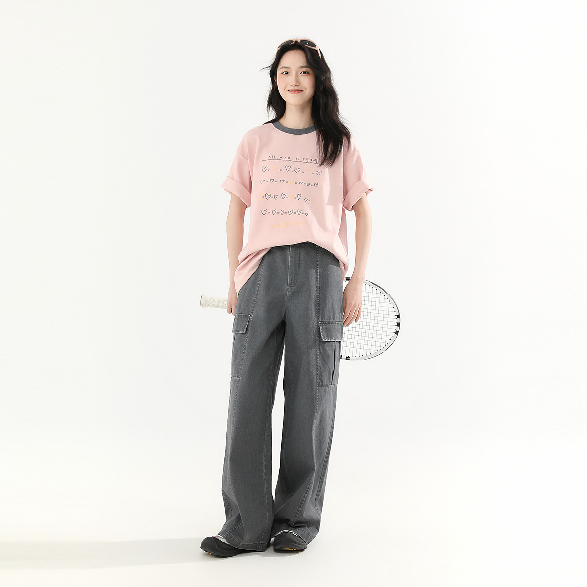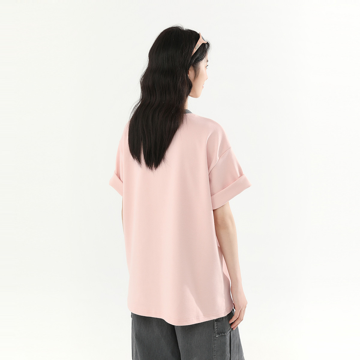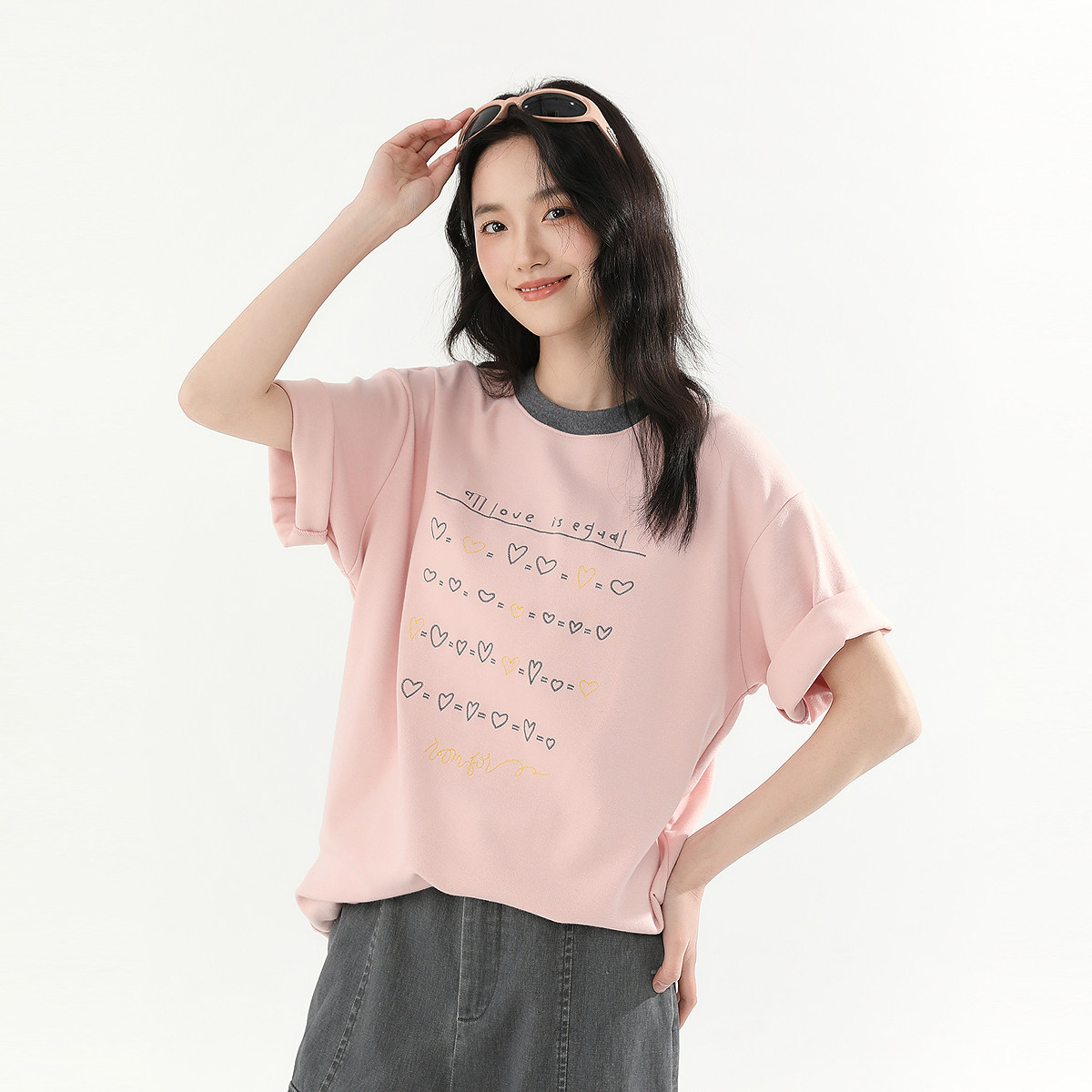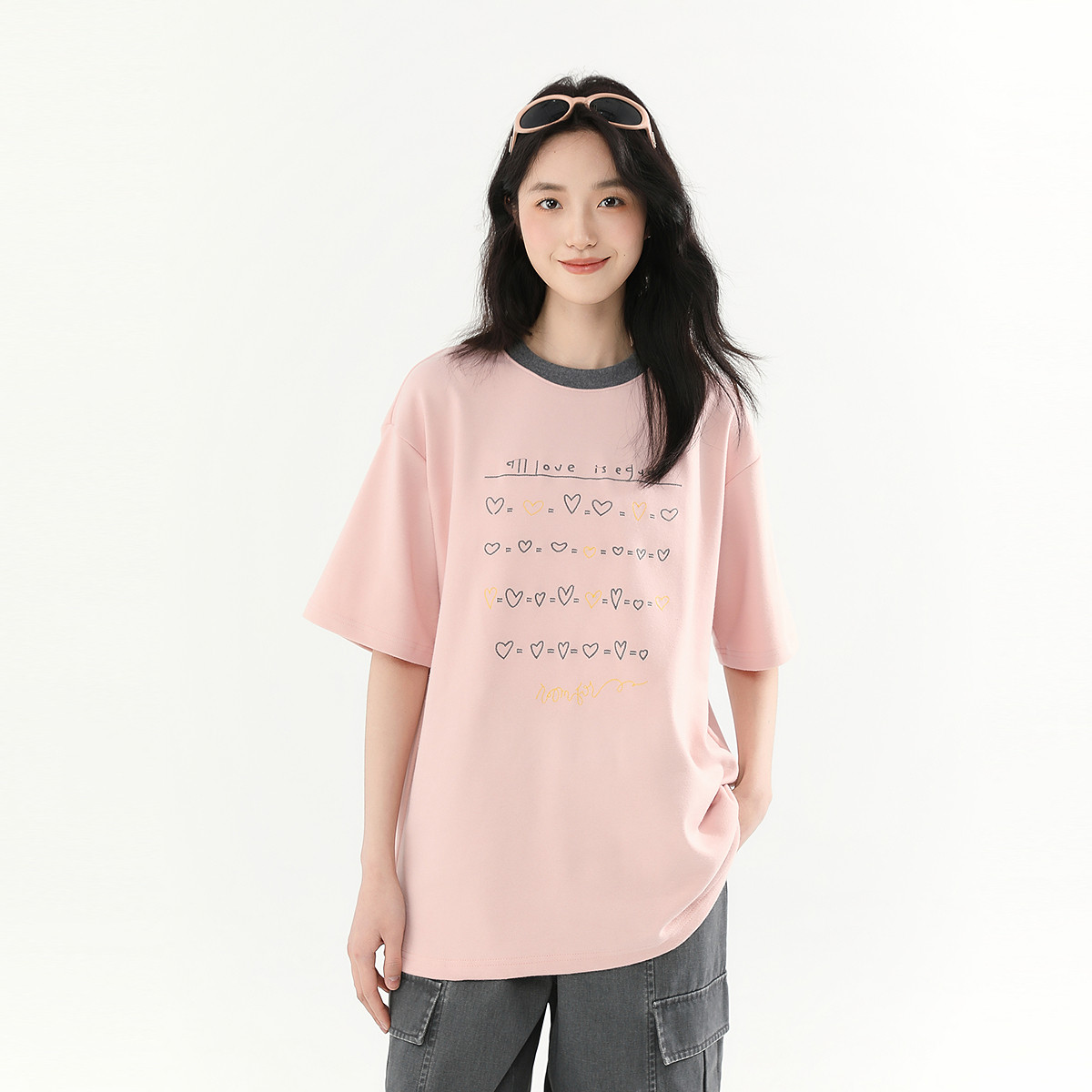 飞鸟和新酒印花短袖T恤女粉色2025春季新款多巴胺穿搭圆领上衣