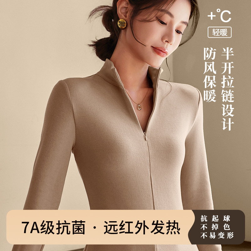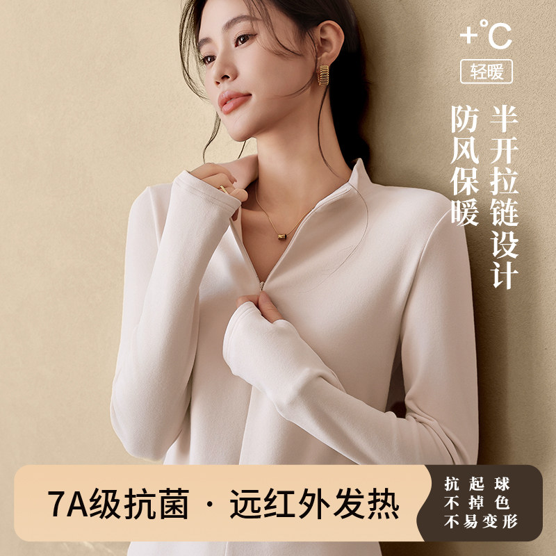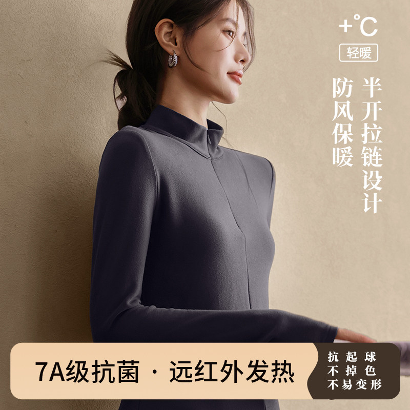 NOW真维斯黑色打底衫女秋冬季拉链薄绒修身长袖t恤半高领内搭上衣