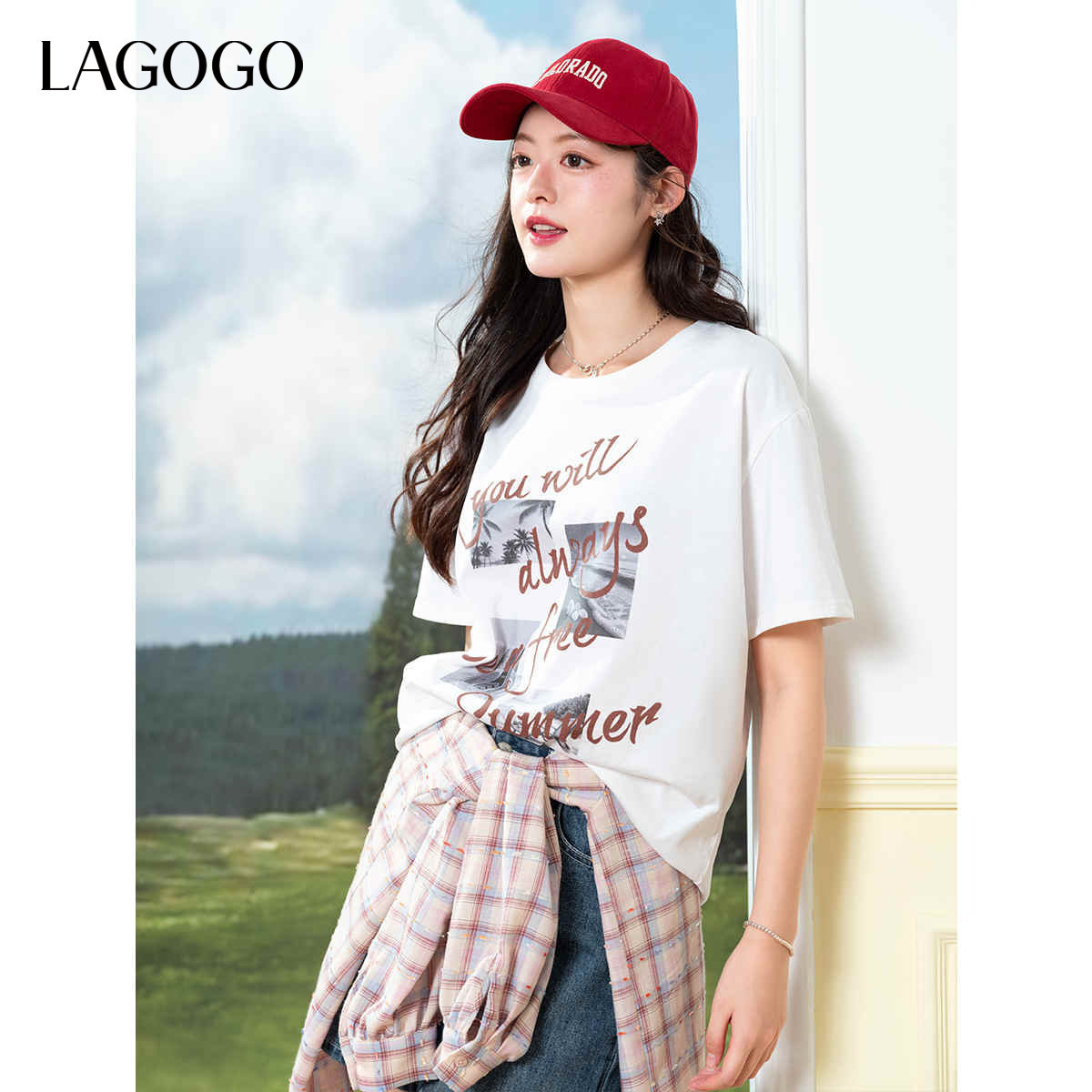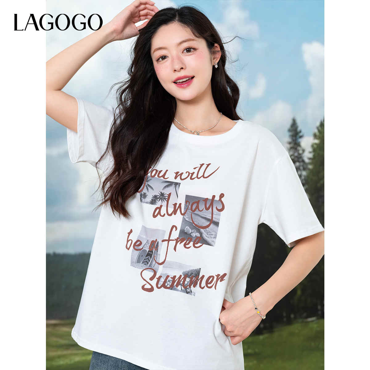 新疆棉LAGOGO度假风印花宽松T恤女拉谷谷夏秋新款纯棉短袖