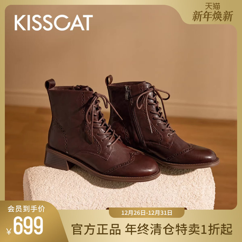 接吻猫[黑胶唱片马丁靴]女新款布洛克短靴复古粗跟水洗牛皮时装靴