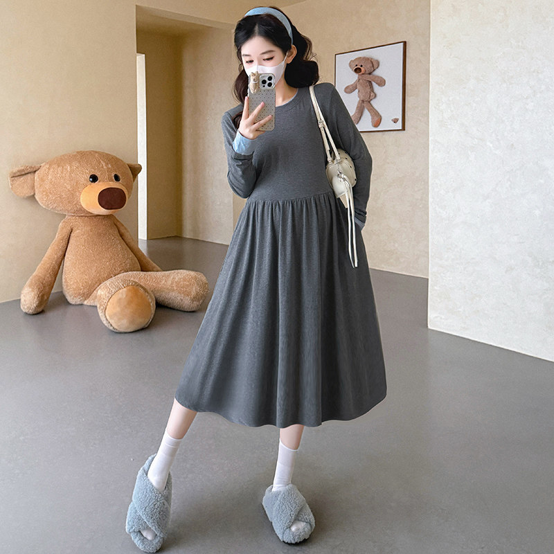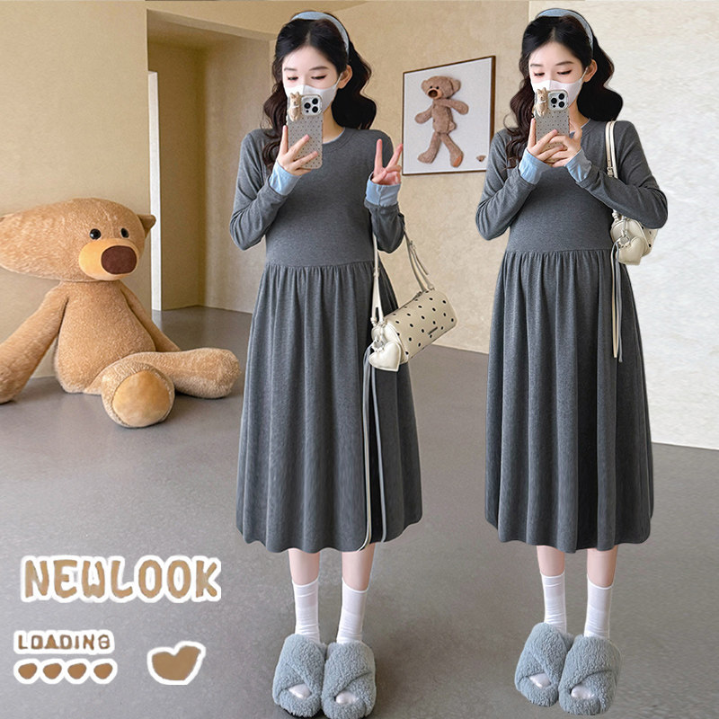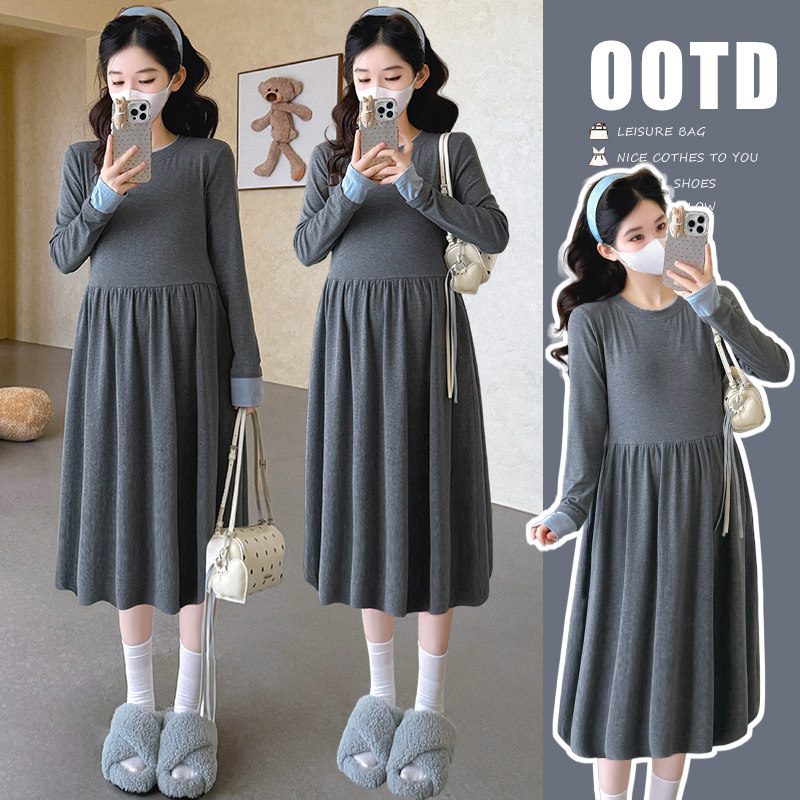 婧麒孕妇连衣裙春秋高级感2026新款拼色长袖百褶拼色假两件裙子女