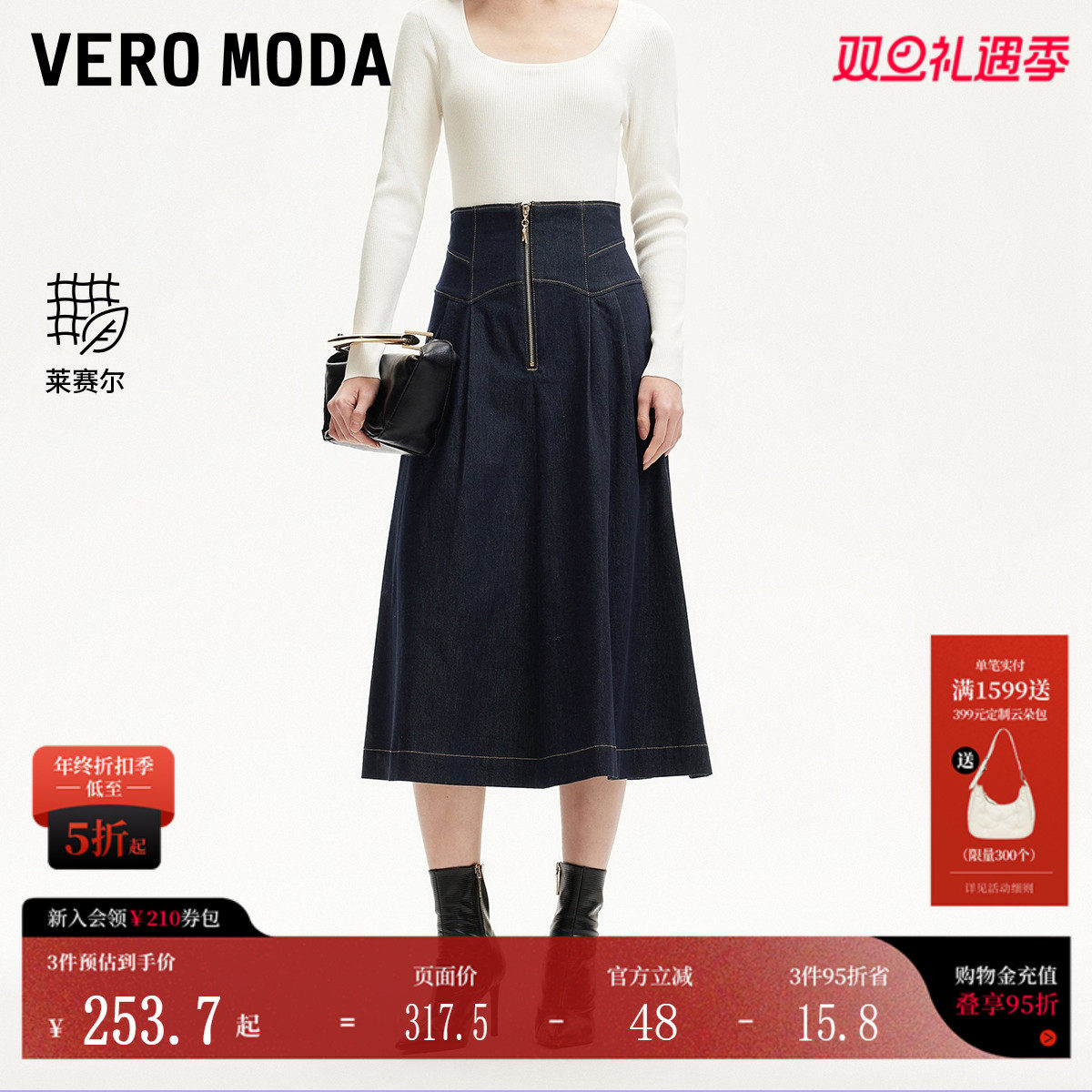 Vero Moda半身裙女25夏款A摆中长款丹宁牛仔裙含莱赛尔325137014