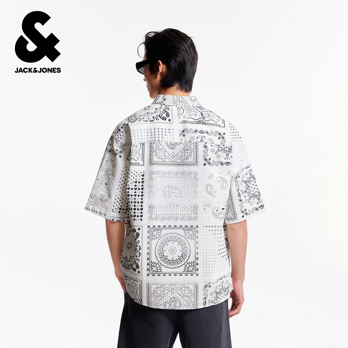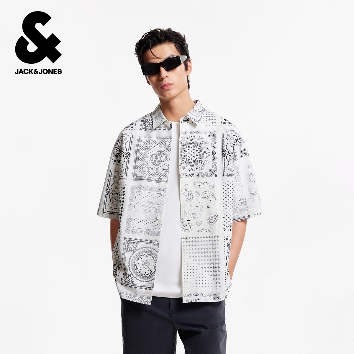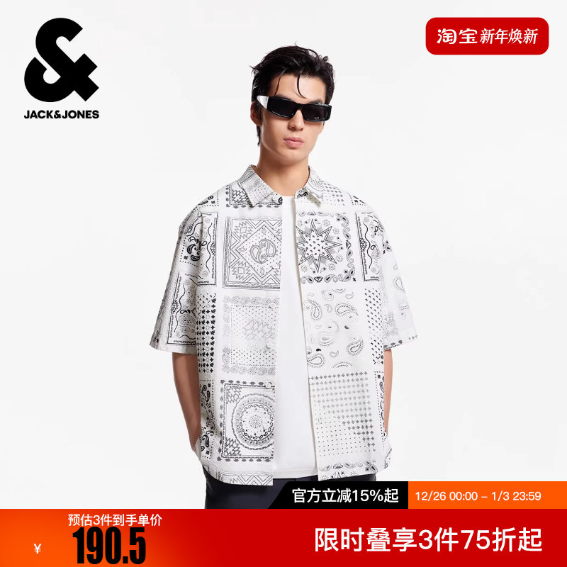 杰克琼斯男装冬新款衬衫百搭经典满印翻领全棉宽松休闲短袖上衣