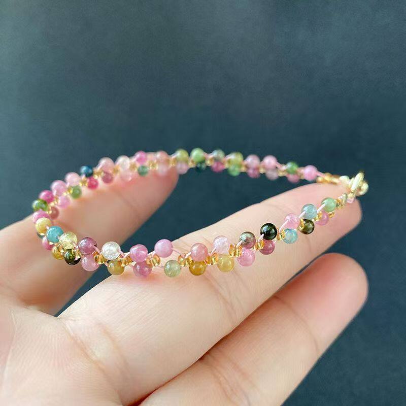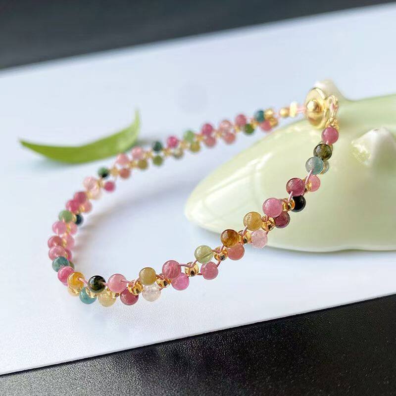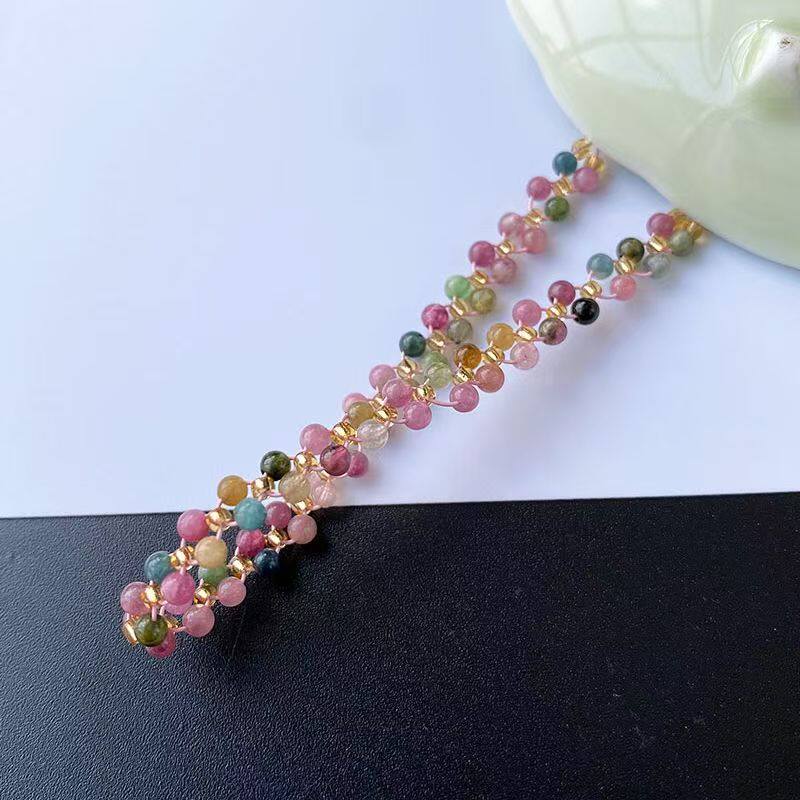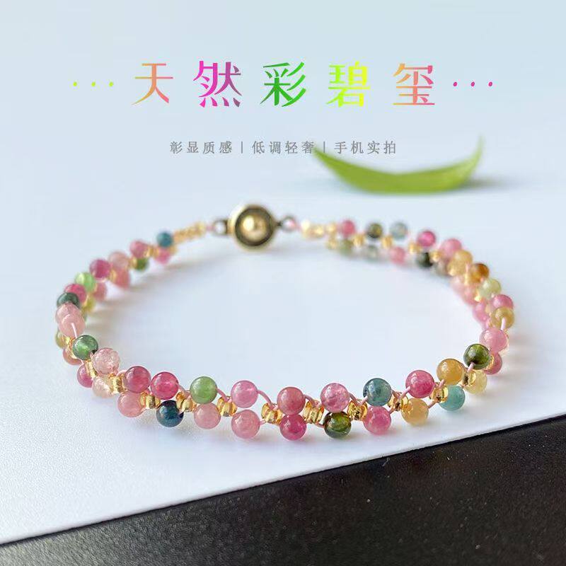 法式小众复古文艺优雅彩色碧玺真石编织花朵串珠日常简约气质手链