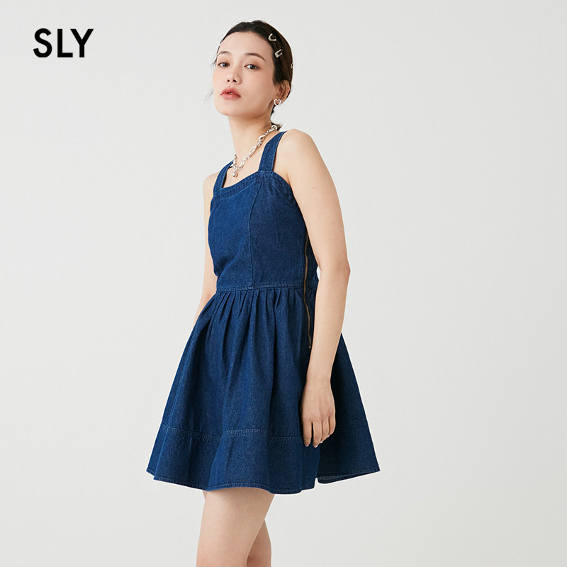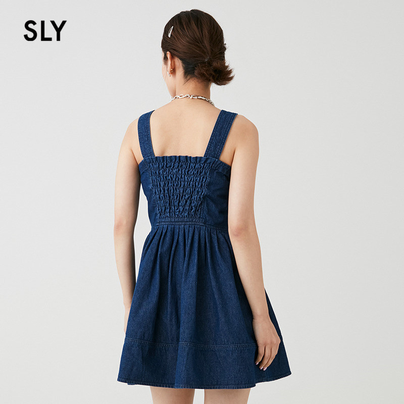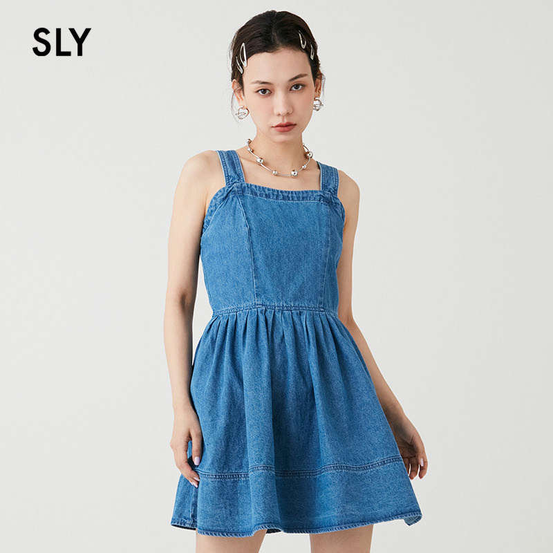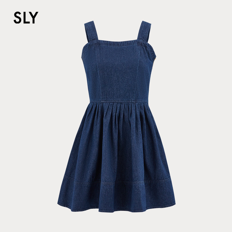 SLY 夏季新品复古丹宁港风捏褶牛仔吊带连衣裙038HSL13-0091