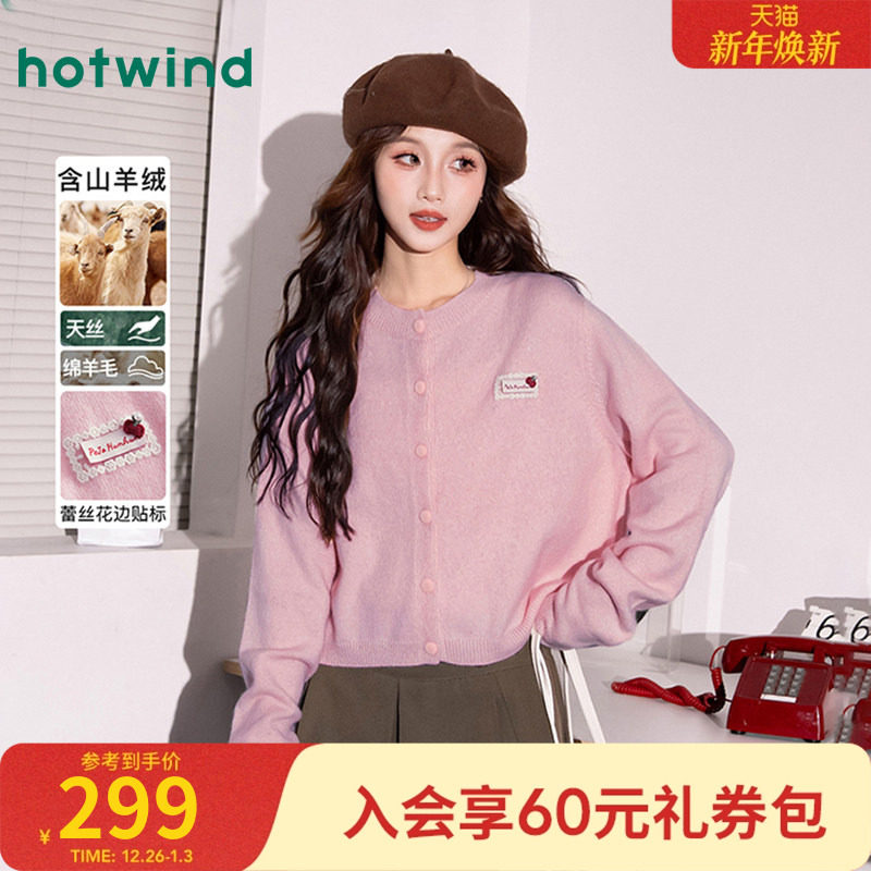 热风女士秋冬新款针织开衫山羊绒亲肤温柔千金风简约毛衣外套