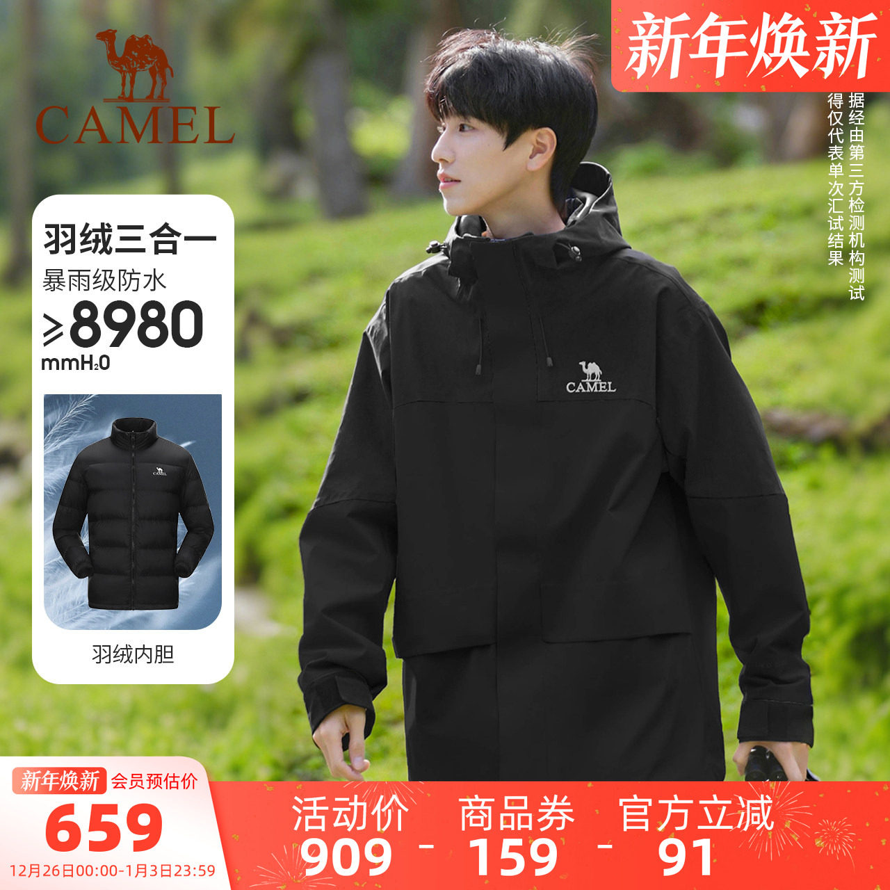 骆驼户外冲锋衣女款25年三合一鹅绒内胆三防保暖羽绒登山服外套男