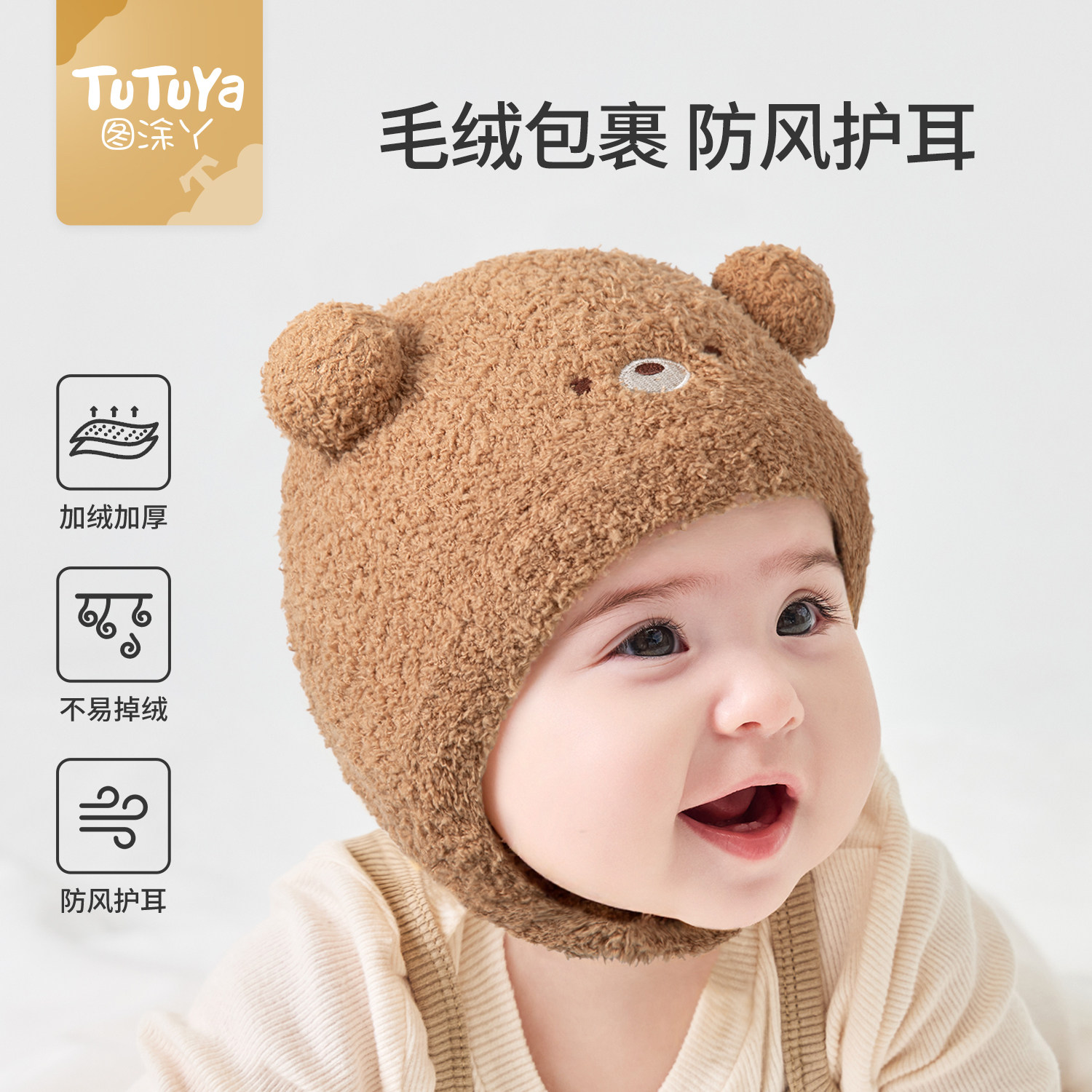 尼多熊婴儿帽子秋围脖一体宝宝毛绒帽防风护耳帽冬季保暖婴幼儿帽