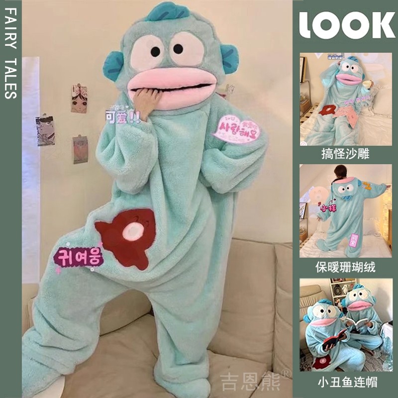 丑鱼睡袍珊瑚绒睡衣秋女款2025新款冬季男加厚睡裙卡通连体家居服