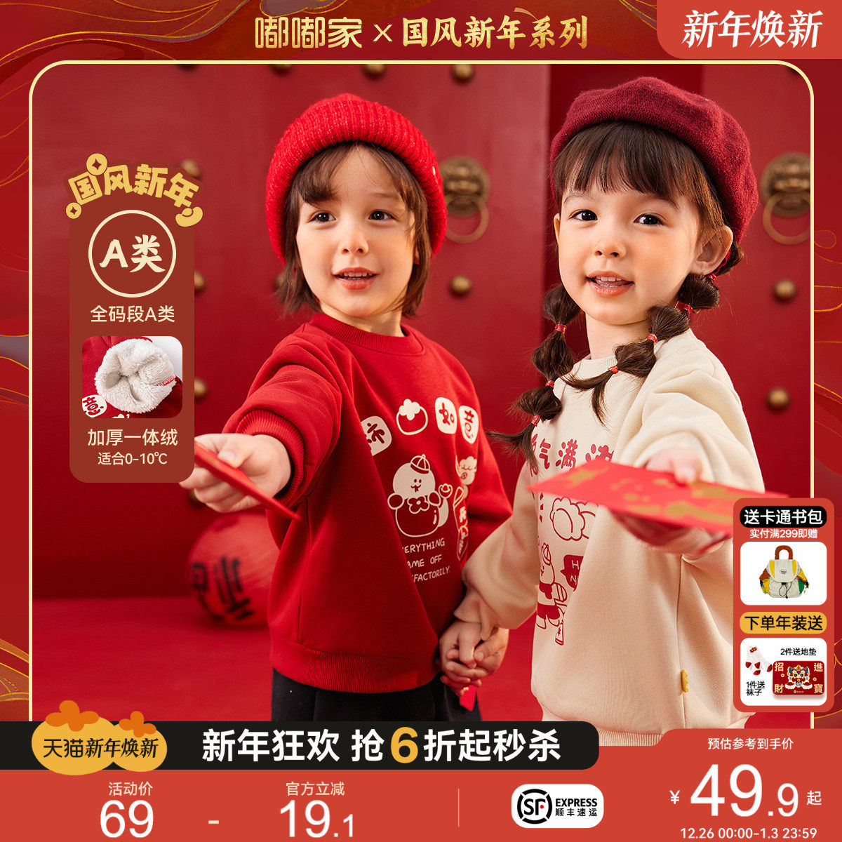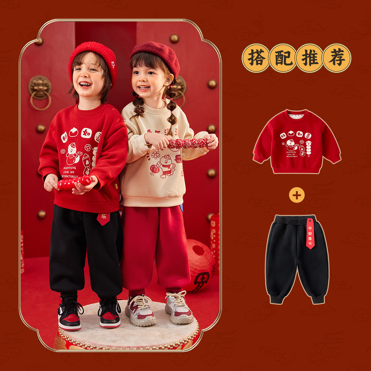 嘟嘟家儿童新年卫衣冬季男童红色拜年服女童加绒唐装宝宝周岁礼服