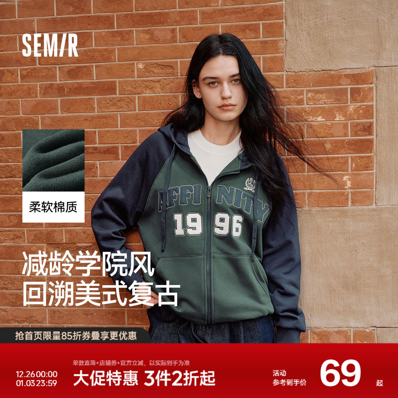 森马外套女连帽插肩袖宽松上衣女士秋季潮流刺绣撞色夹克美式复古