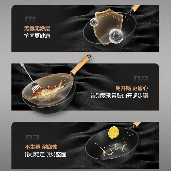 德国三头鹰无涂层钛锅不粘锅电磁炉燃气纯钛炒锅多功能家用炒菜锅