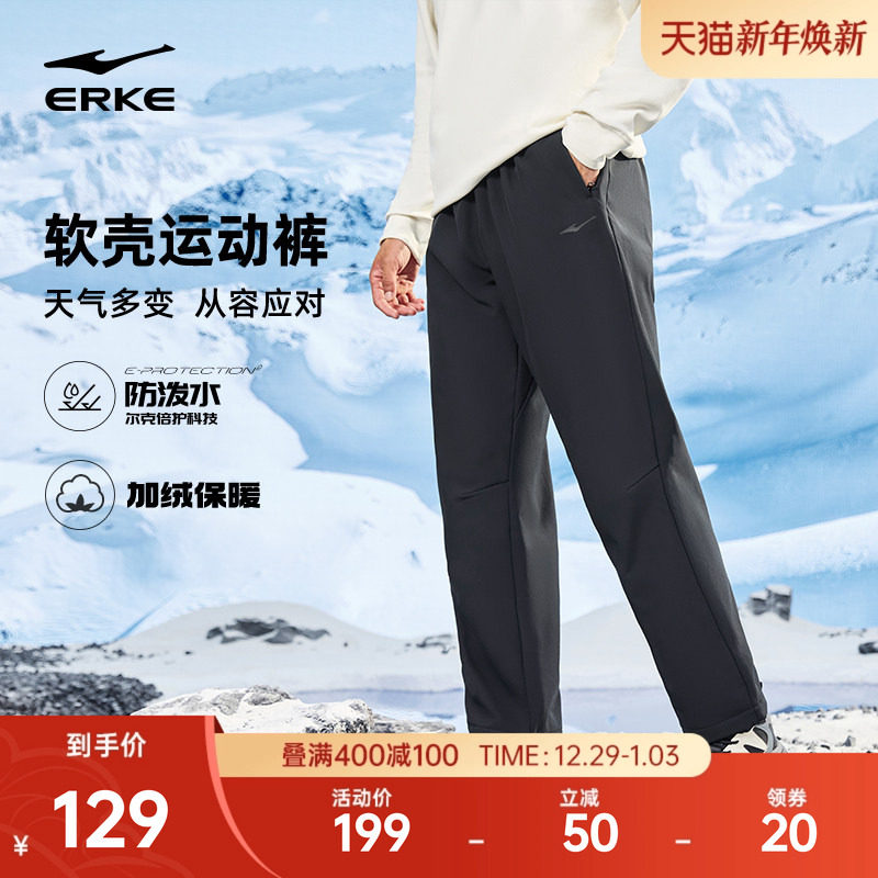 鸿星尔克裤子冬加厚男防风直筒长裤男士软壳运动裤爸爸休闲裤男裤