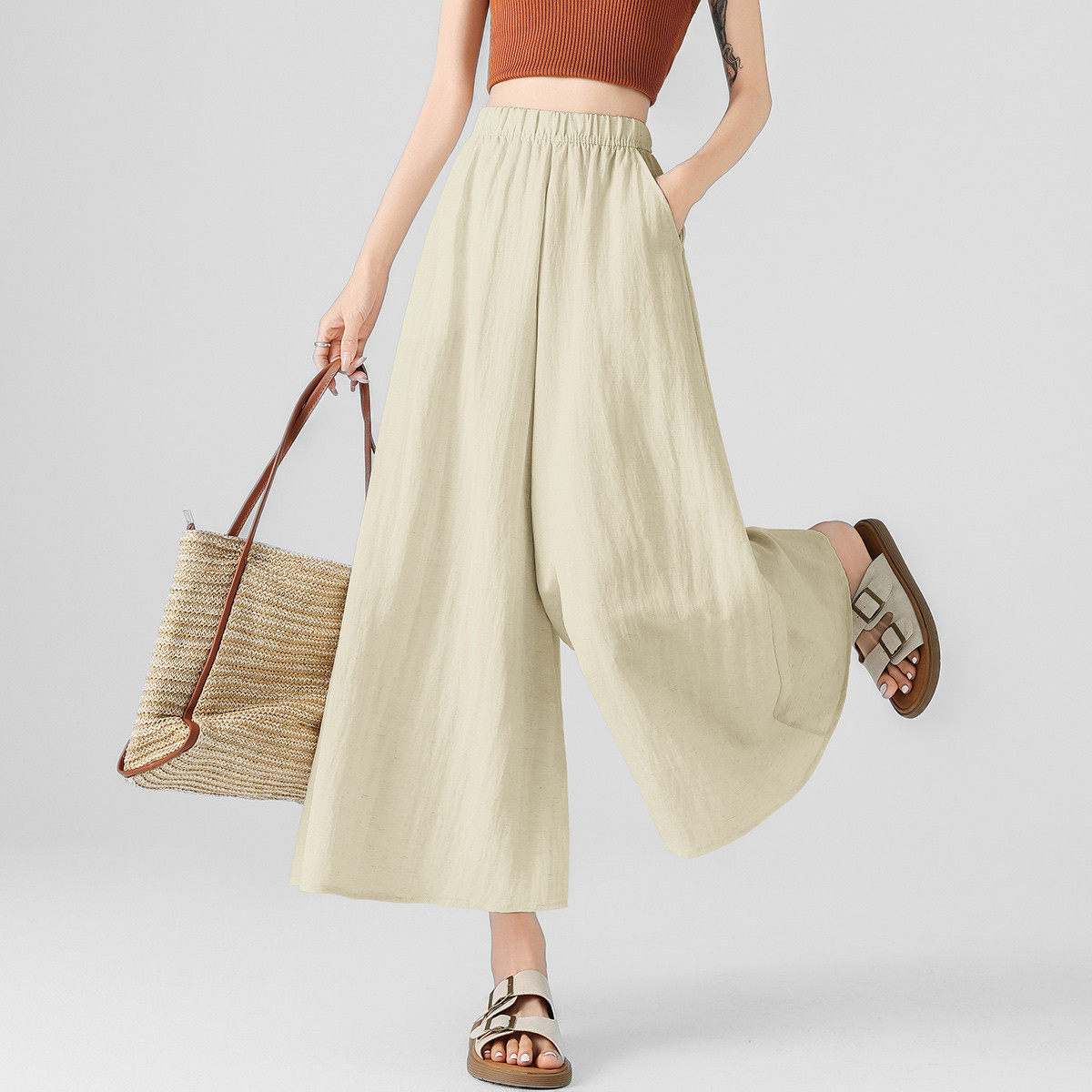 双侧带口袋棉绸绵绸人造棉高腰显瘦直筒裤女宽松休闲百搭阔腿长裤