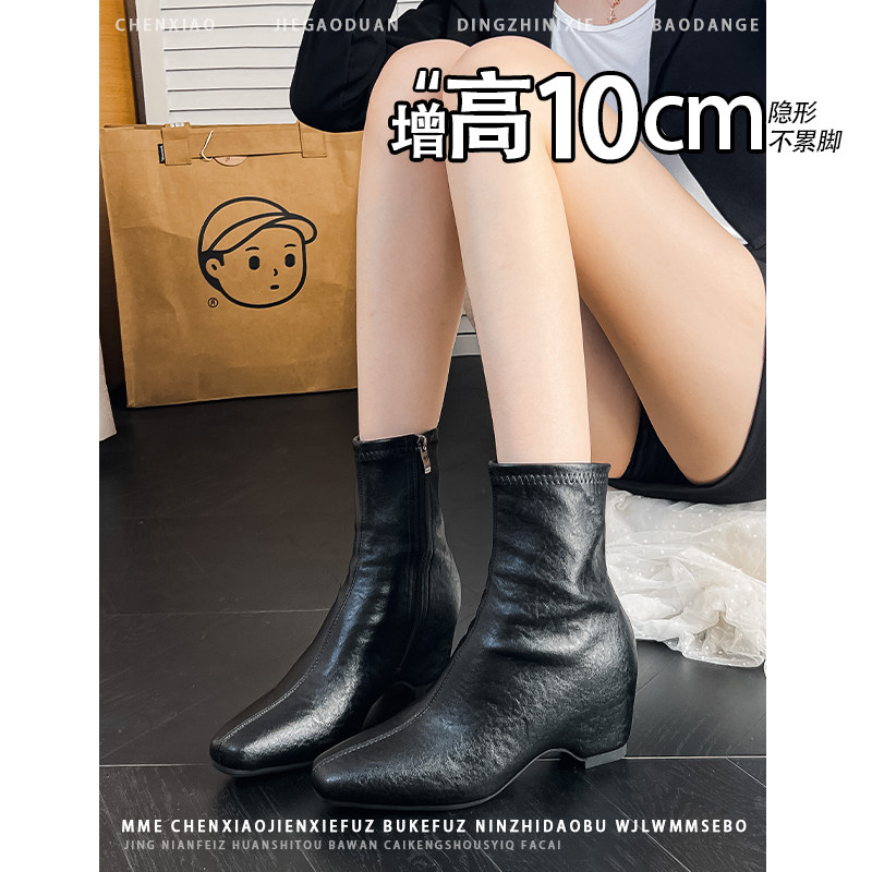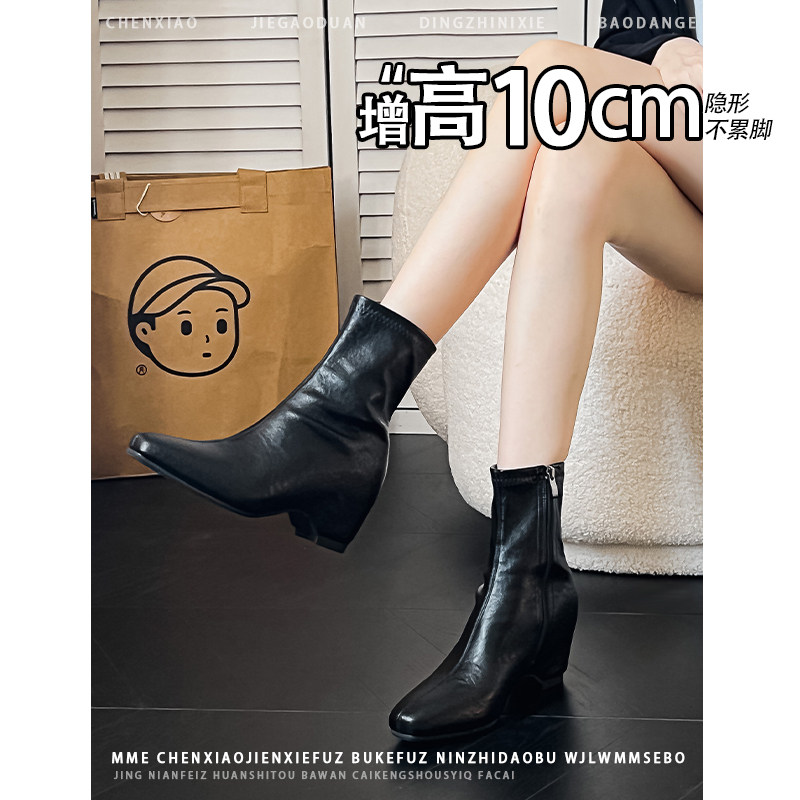 内增高10CM!不累脚黑色方头亮面2025冬季新款侧拉链猫跟短筒靴女