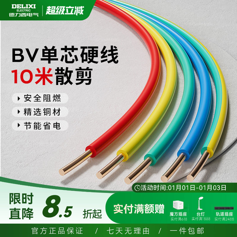 德力西阻燃电线家用bv2.5电缆纯铜芯国标4 10 6平方铜线10米散剪