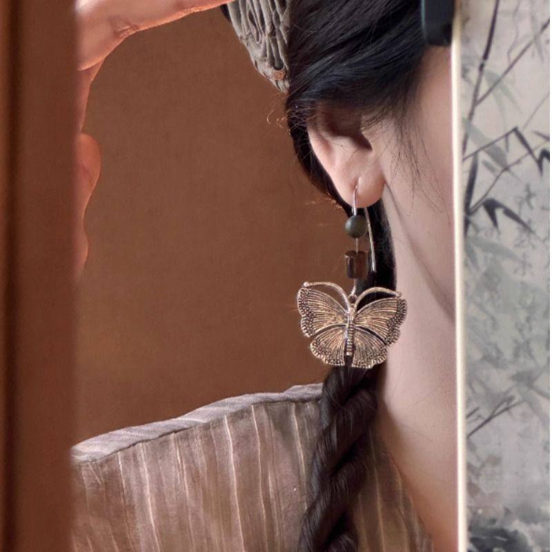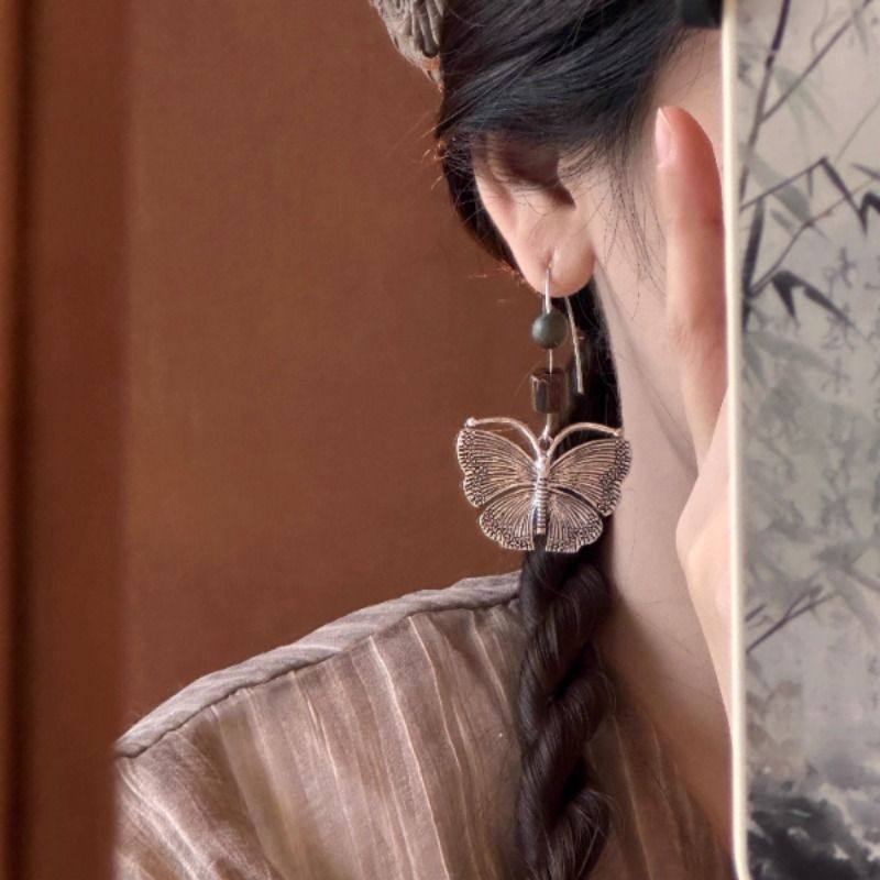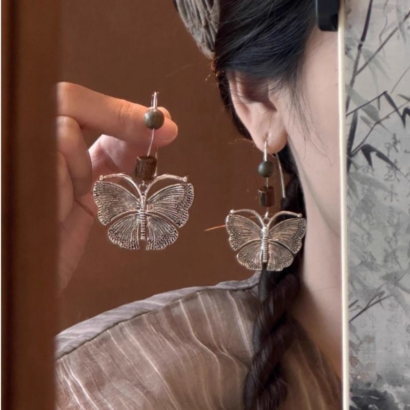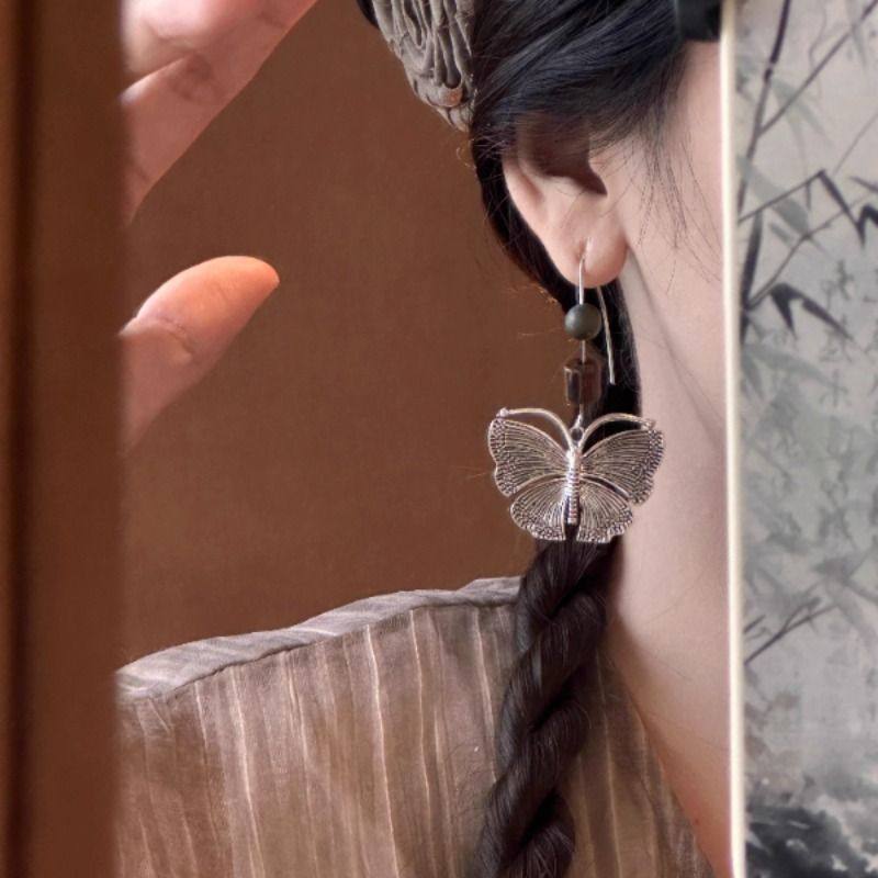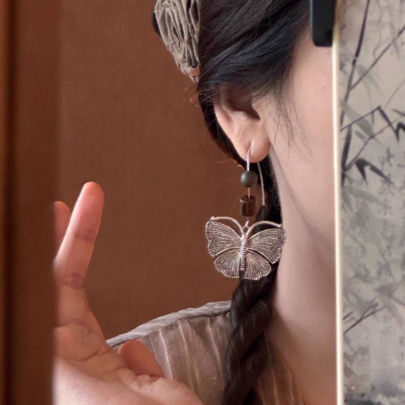 汉服旅拍轻奢银色蝴蝶新款小众高级感森系耳环民族风气质耳钩女