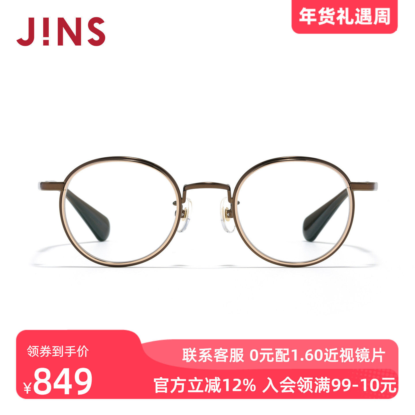 JINS睛姿含镜片小圆框钛眼睛显大近视镜可配防蓝光镜片UTF25S304