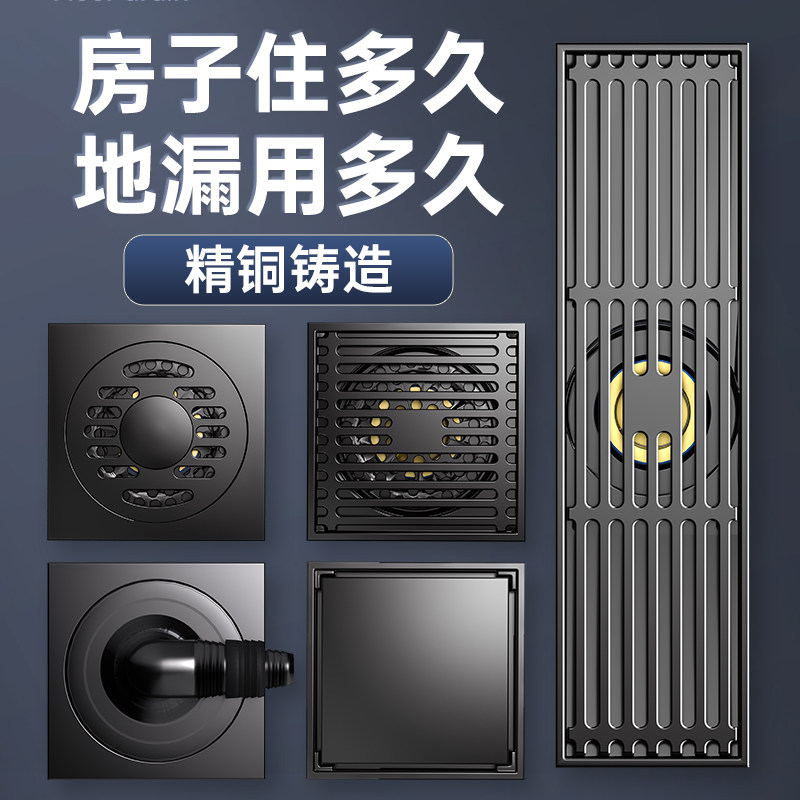 枪灰色地漏全铜防臭器卫生间淋浴房下水道长条隐形浴室洗衣机方形