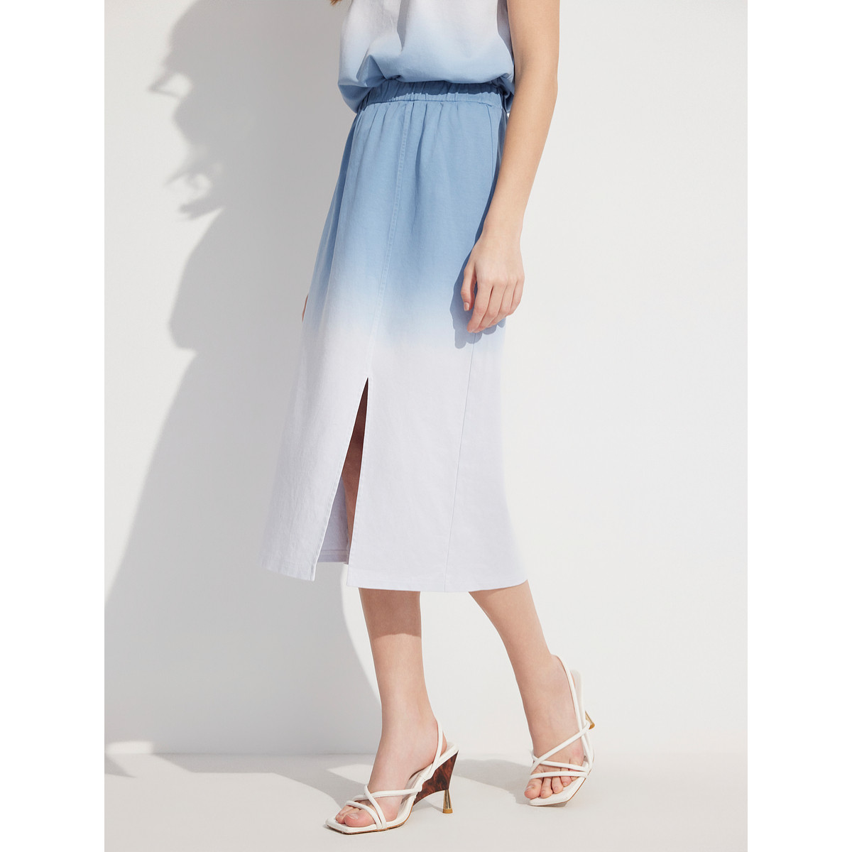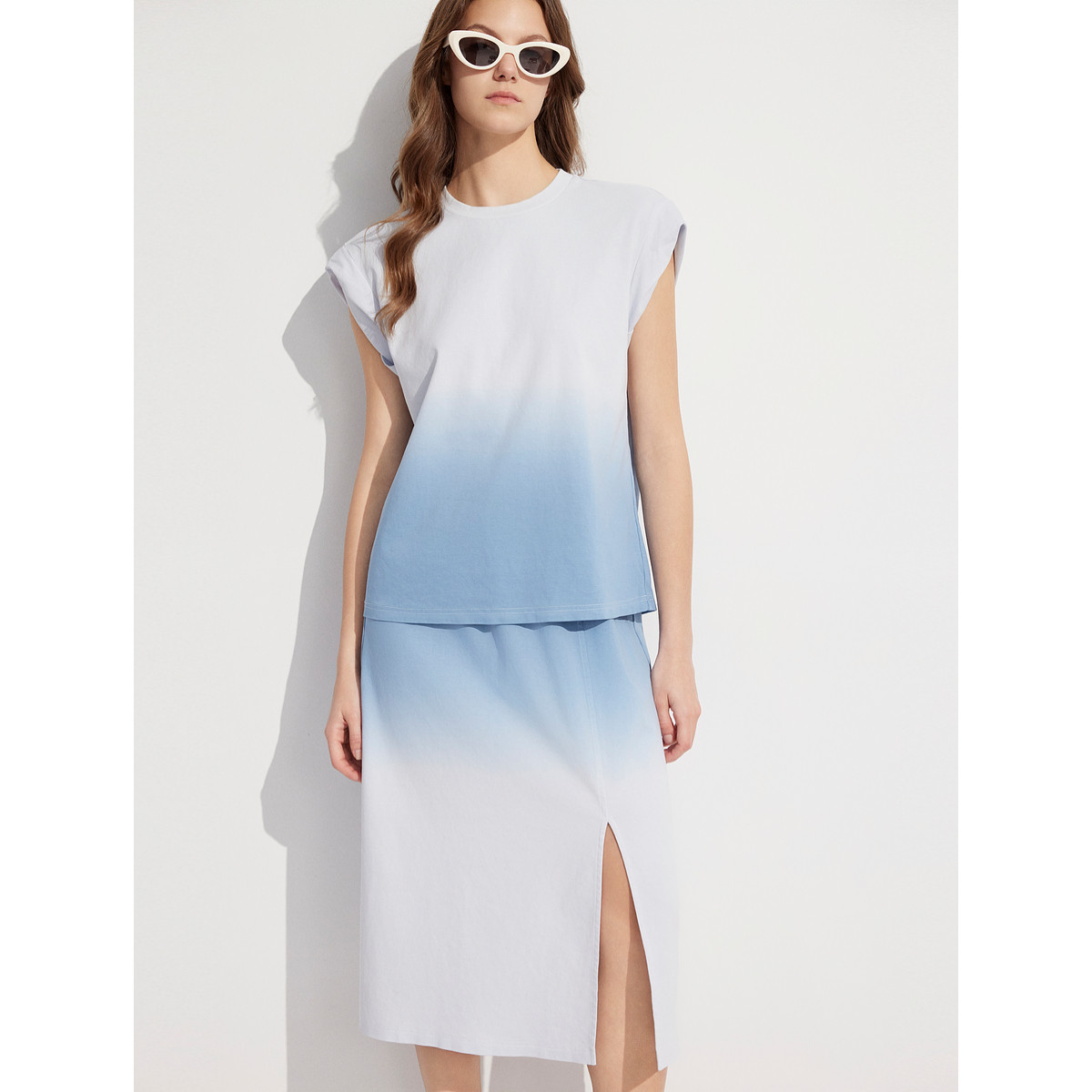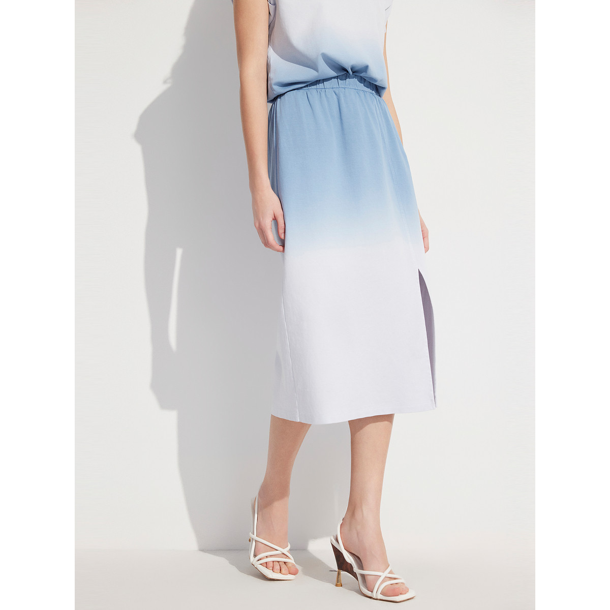 ELLE法式高级感渐变短袖T恤套装女2025夏新款高腰显瘦开叉半身裙
