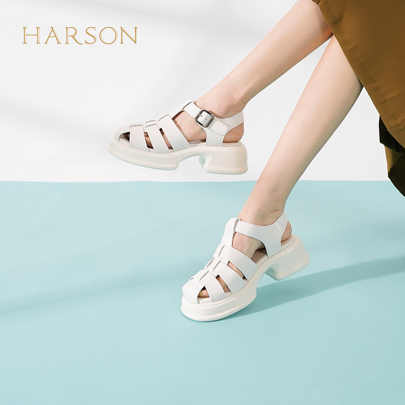 哈森运动凉鞋女夏季商场同款粗跟猪笼鞋女时尚编织粗跟鞋HM231601