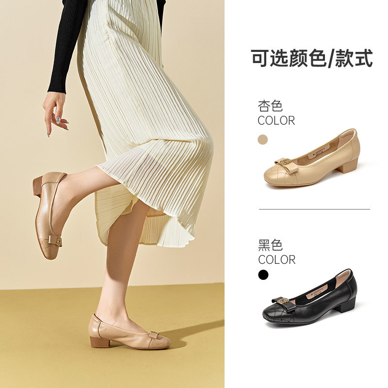 米霏~真皮奶奶鞋女粗跟2026春款法式单鞋中跟浅口晚晚鞋大码女鞋