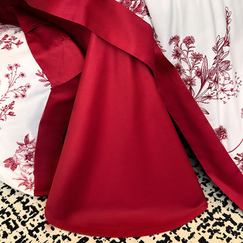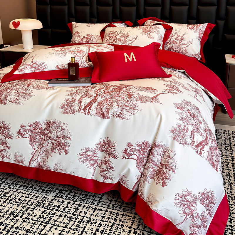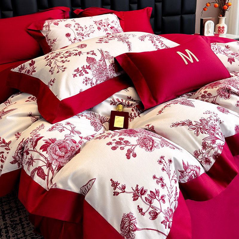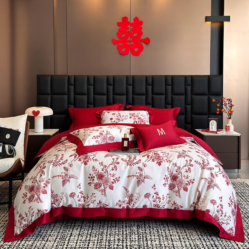 A类200支纯棉印花婚庆四件套大红色床单被套婚房全棉结婚床上用品