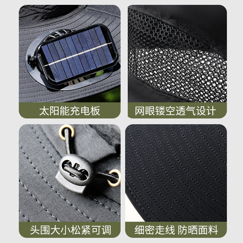 太阳能风扇帽男夏季成人钓鱼防晒帽遮阳帽户外大檐透气渔夫帽黑色