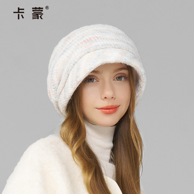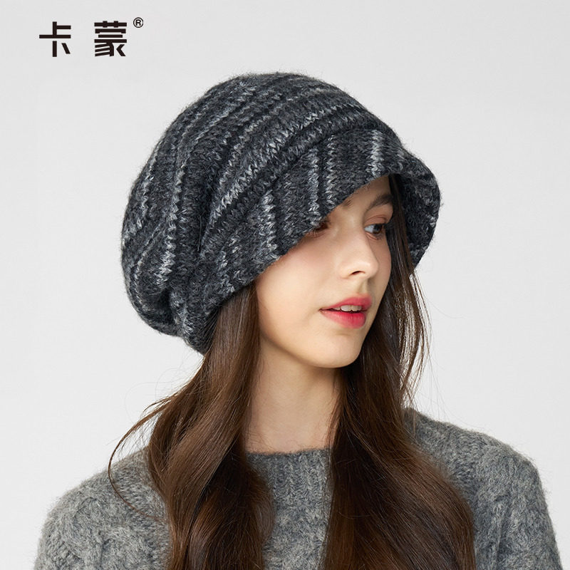 卡蒙彩色羊毛针织贝雷帽女护耳摇粒绒加绒保暖毛线帽后托堆堆帽