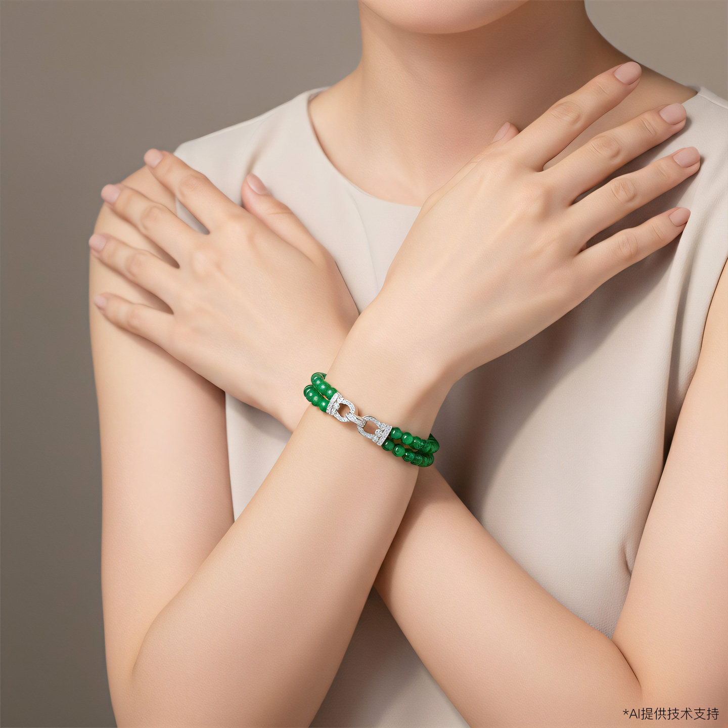 AILEQ 925银镶天然玉髓满绿双环小米珠手链时尚珠宝欧若风手串K10