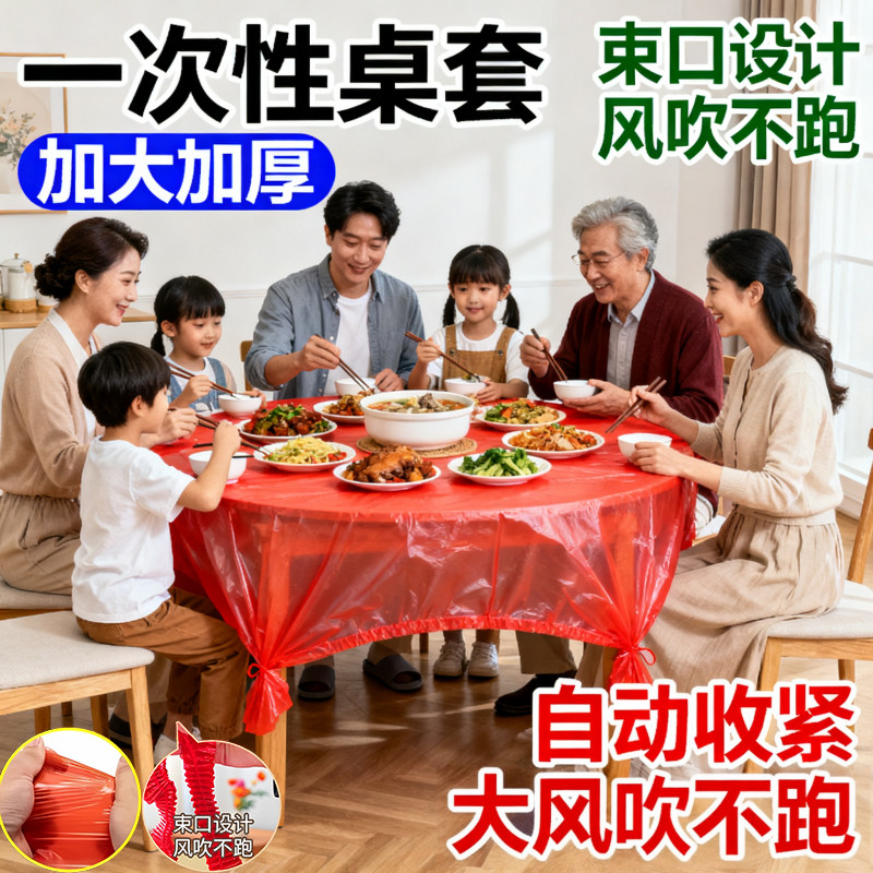 松紧束口桌布一次性家用加厚免洗透明红色餐馆饭店酒席婚庆桌套