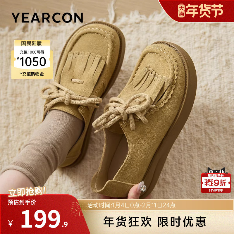 意尔康女鞋2025秋季平底休闲单鞋全包勃肯鞋复古流苏小皮鞋袋鼠鞋