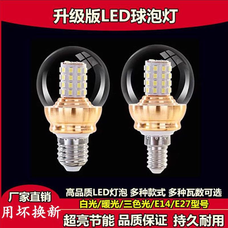 LED超亮灯泡三色变光家用螺口5瓦7W吊灯E27透明小圆球泡魔豆光源