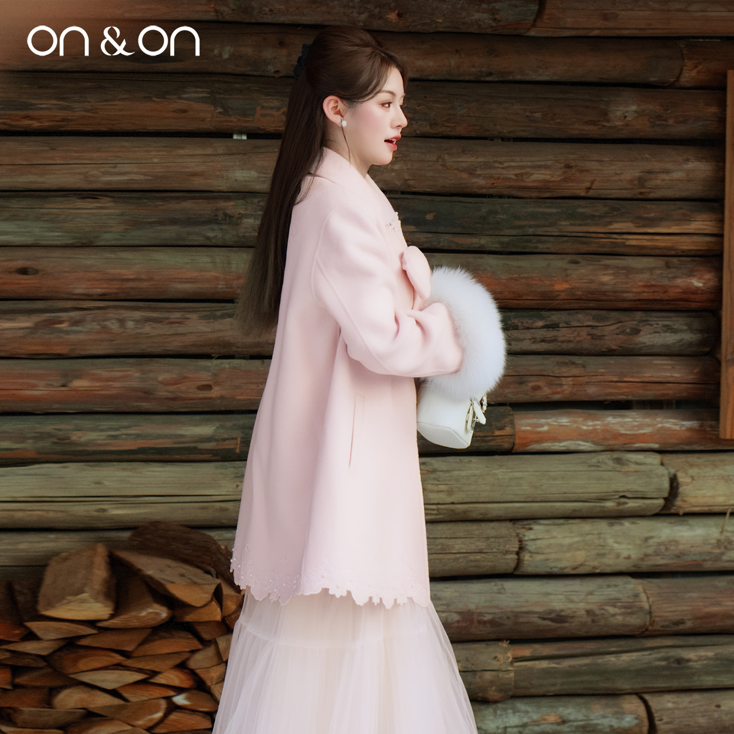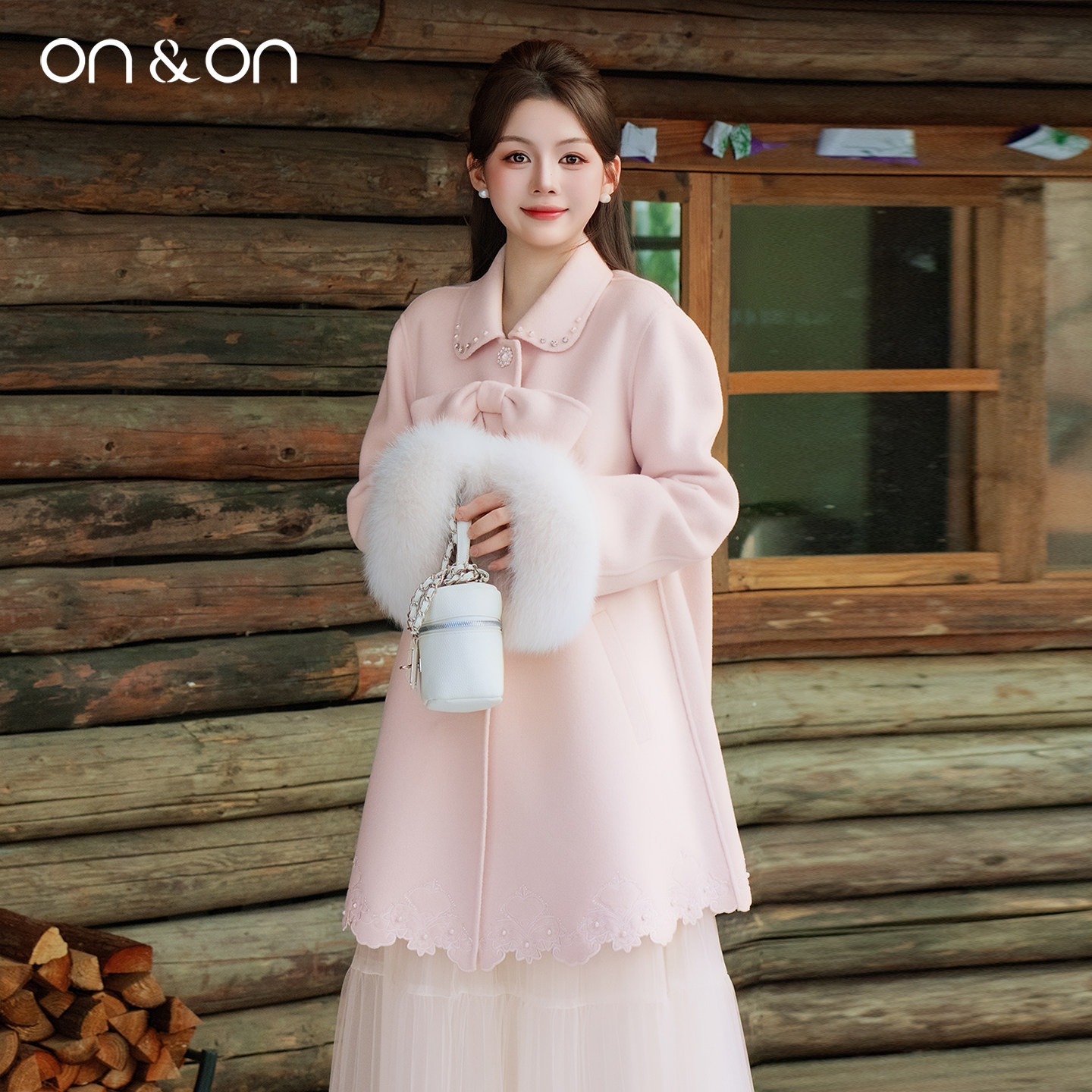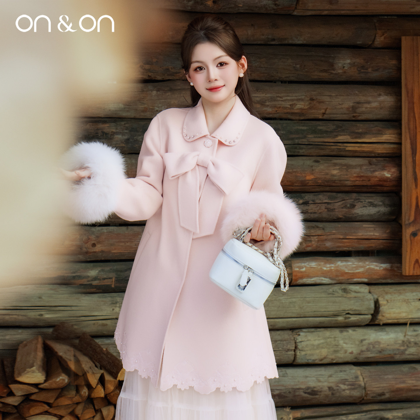 ON&ON/安乃安2025冬季新款韩系蝴蝶结千金风钉珠狐狸毛羊绒大衣