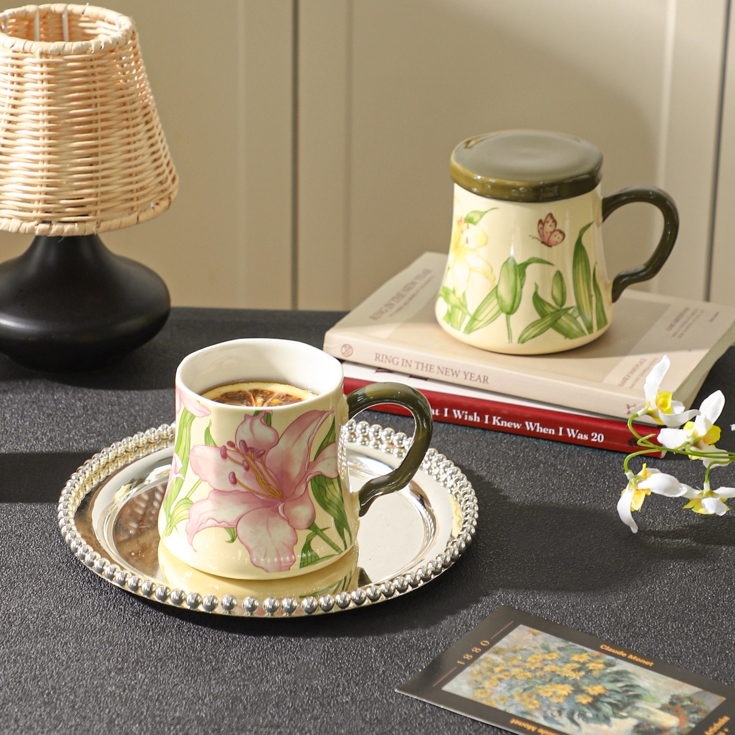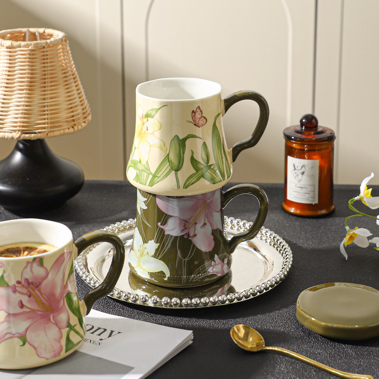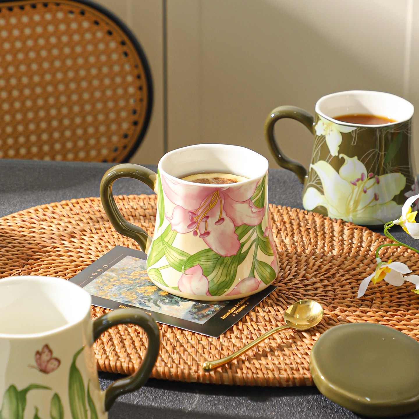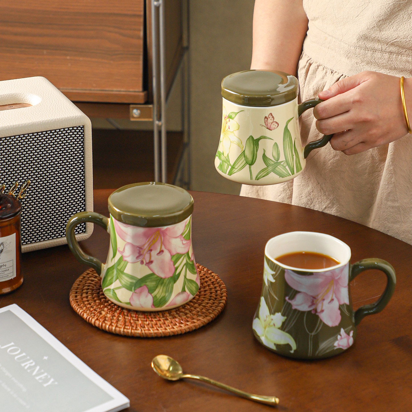 舍里复古花卉带盖陶瓷马克杯家用早餐杯办公室喝水杯女牛奶咖啡杯