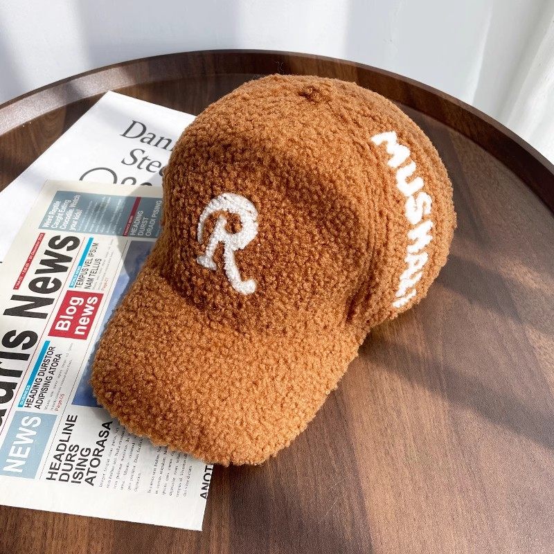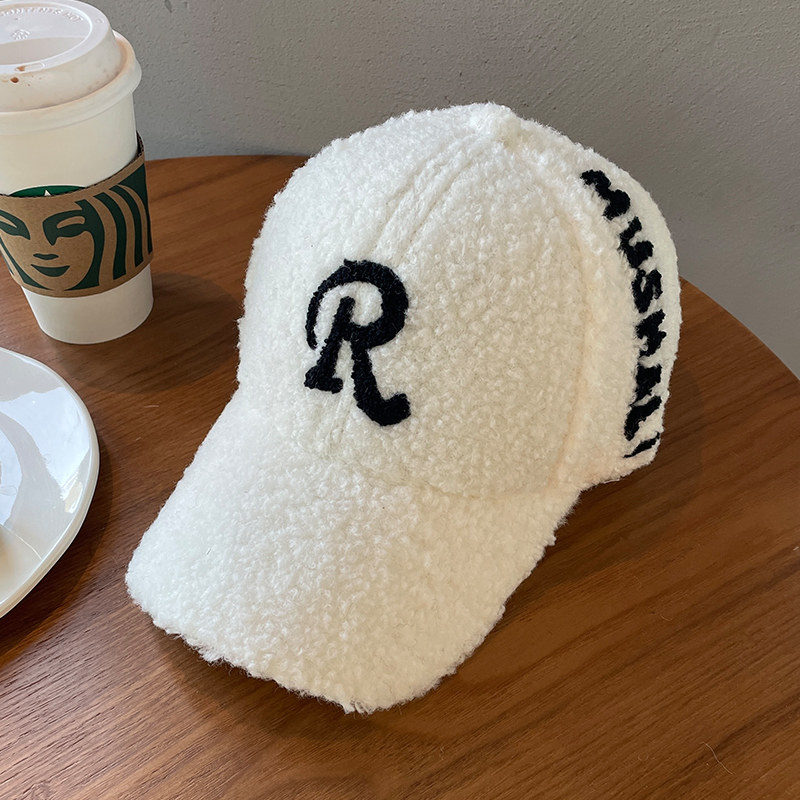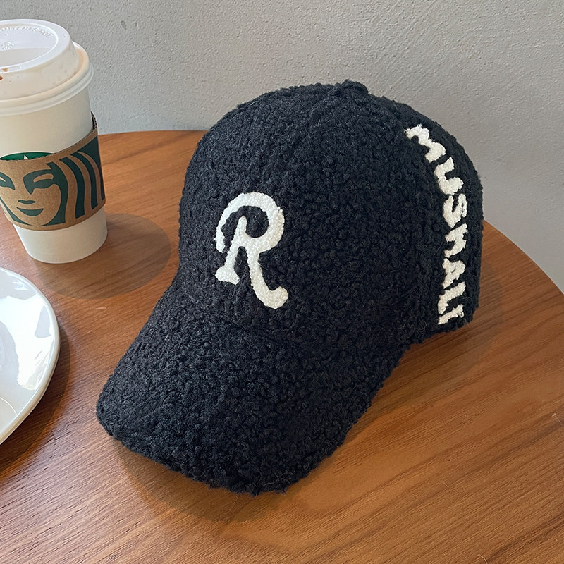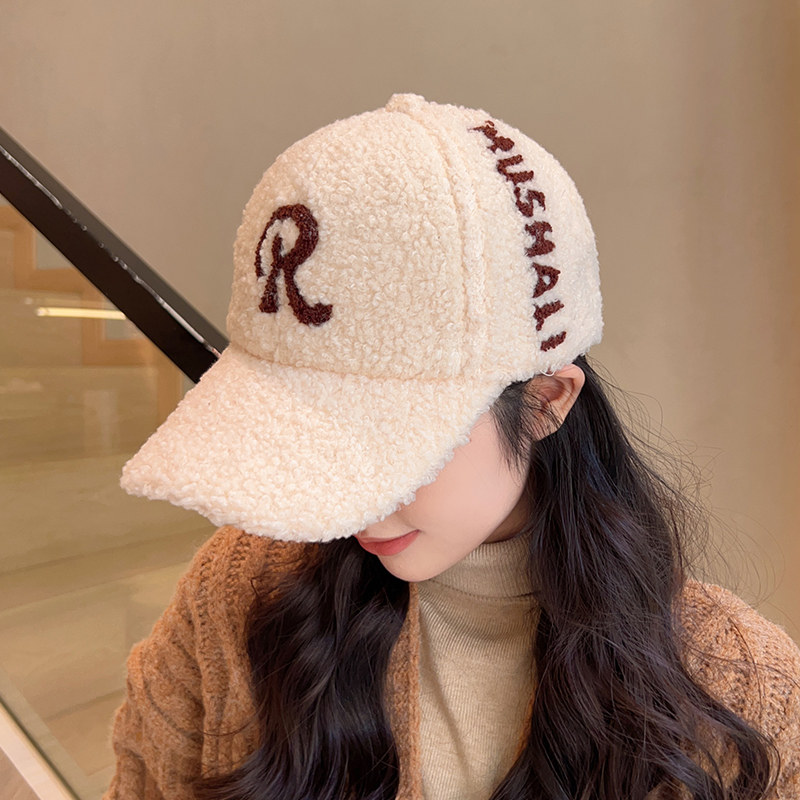 刺绣羊羔绒棒球帽子女秋冬毛绒保暖鸭舌帽帽檐大头帽子围百搭显脸