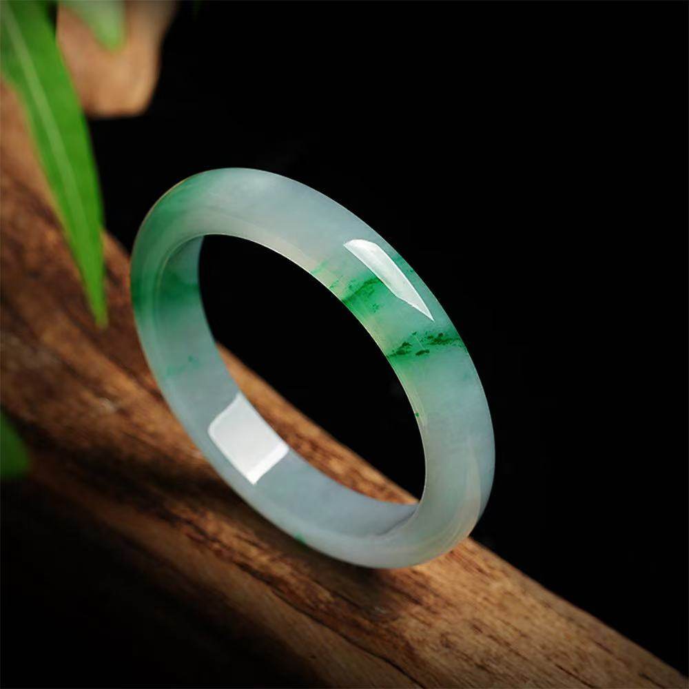 缅甸翡翠平安玉手镯正品少女款冰透飘花半山半水阳绿玉镯飘绿正圈