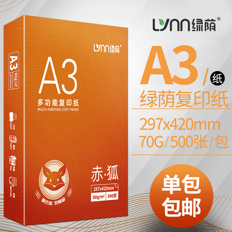 绿荫a3纸学生打印复印纸单包一包500张70g白色a三打印纸试卷纸双面白纸一箱整箱纸批发草稿纸绘画纸正品包邮