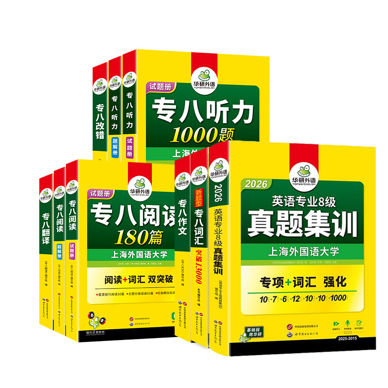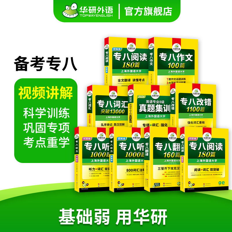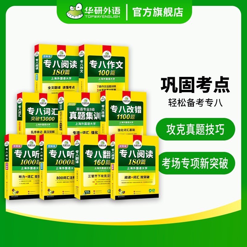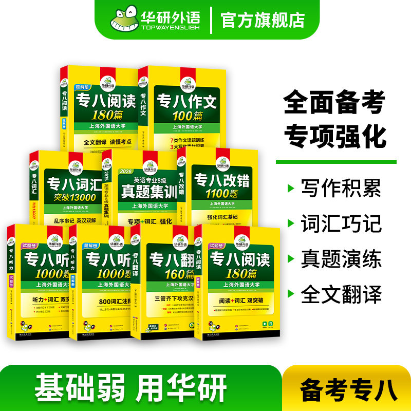 华研外语备考2026专八真题集训专项训练英语专业八级历年真题试卷单词汇听力改错阅读理解翻译精品写作文范文tem8级全套学习资料书