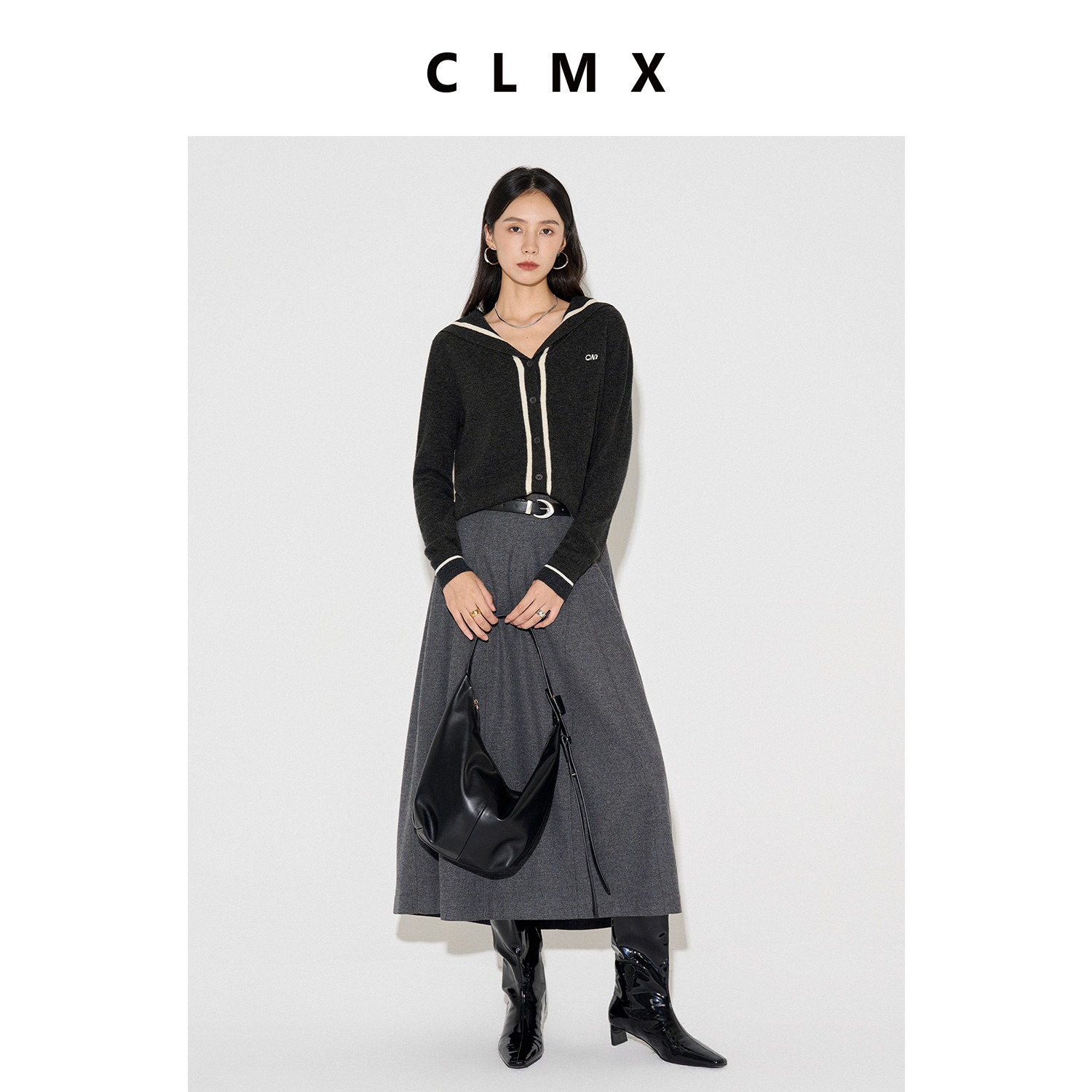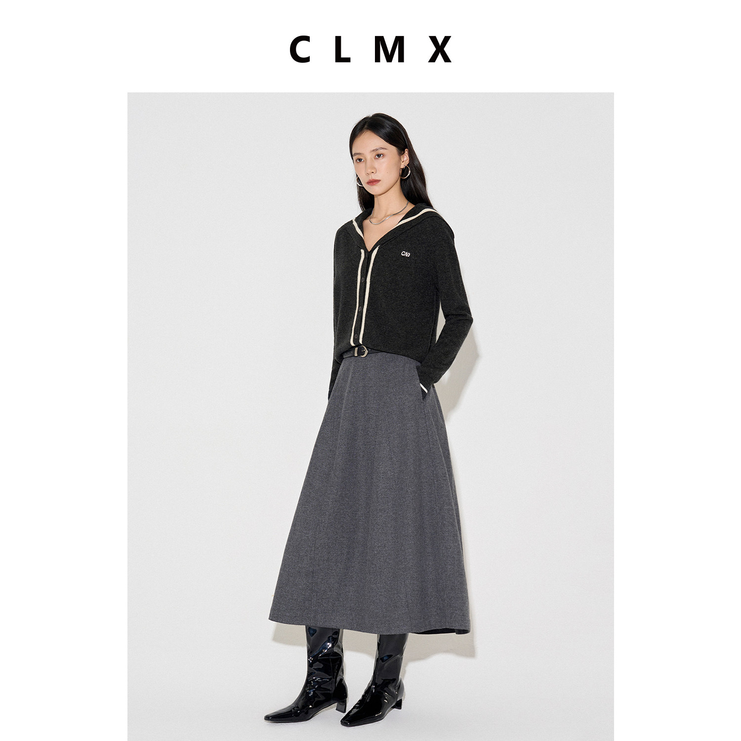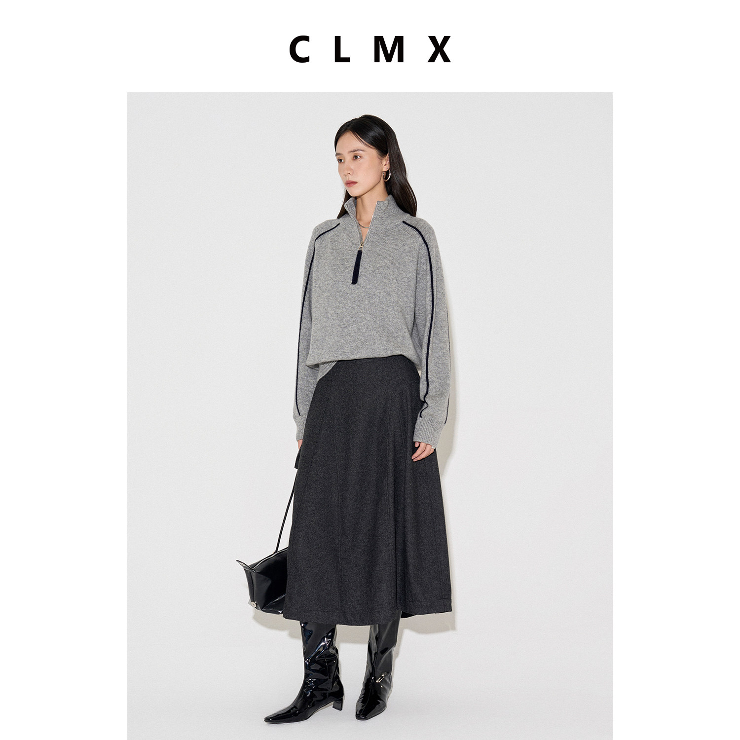 CLMX格雷系后腰松紧量感A摆半身裙挺括有型羊毛混纺斜纹薄呢裙子