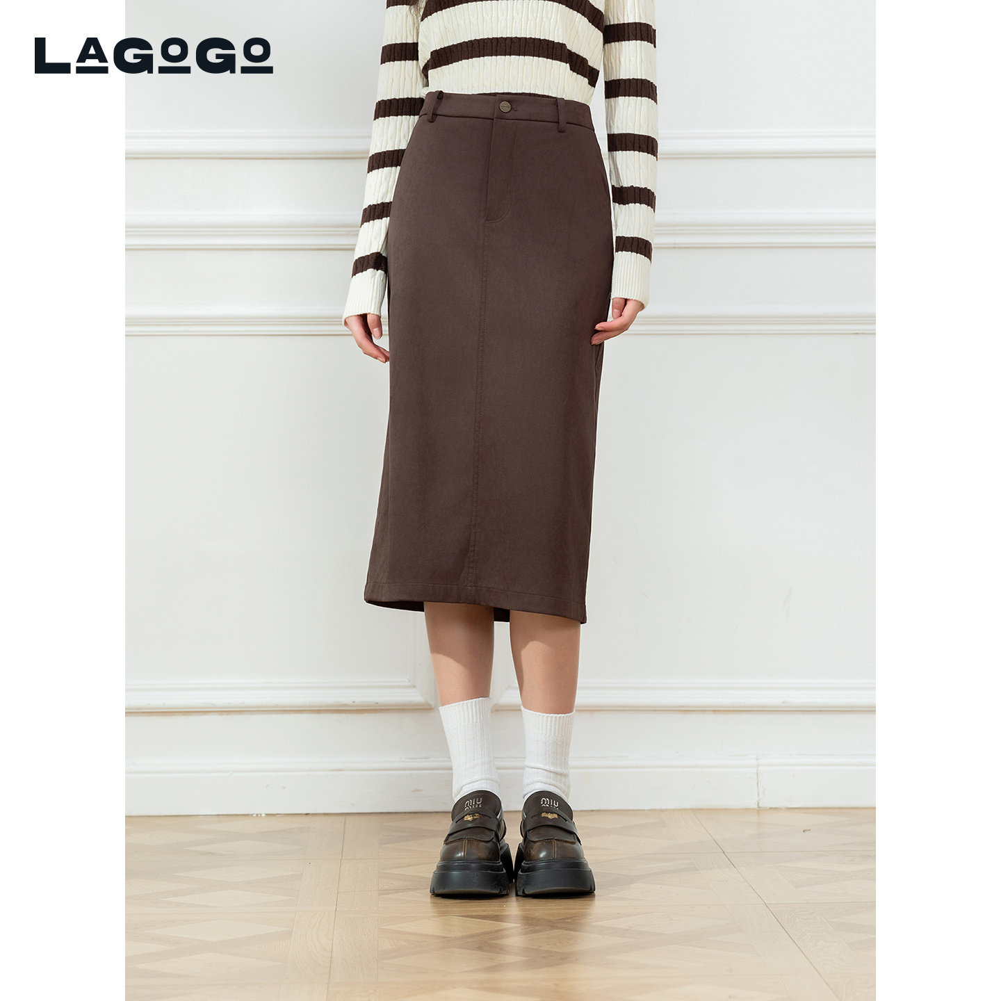 LAGOGO琥珀流光半身裙女拉谷谷2025冬季新款咖啡色裙子ODBB339C58