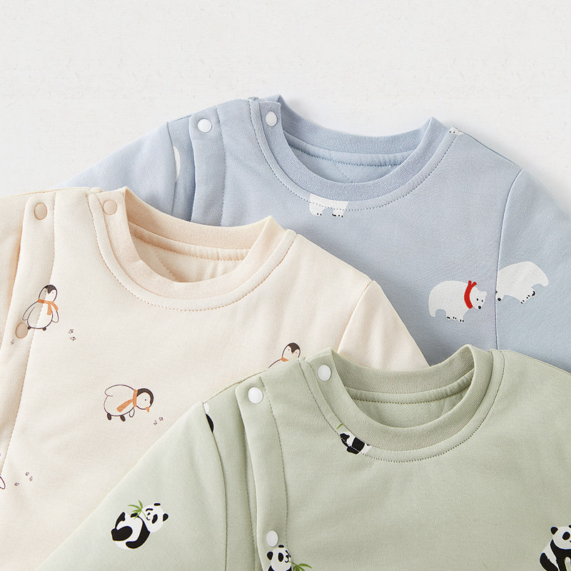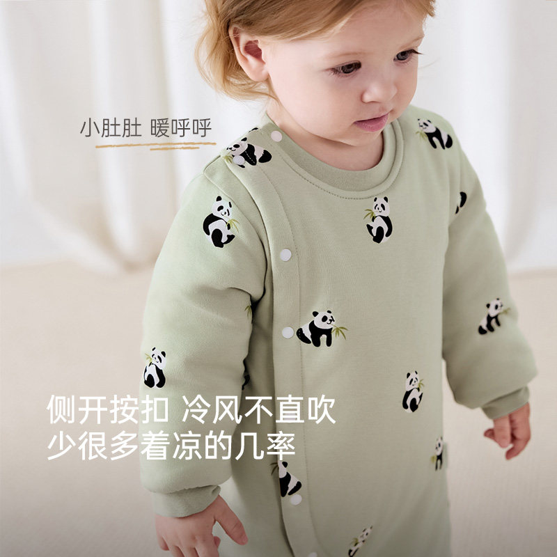 小猪大卫新生儿秋季保暖连体衣男女宝宝卡通印花中开夹棉爬服