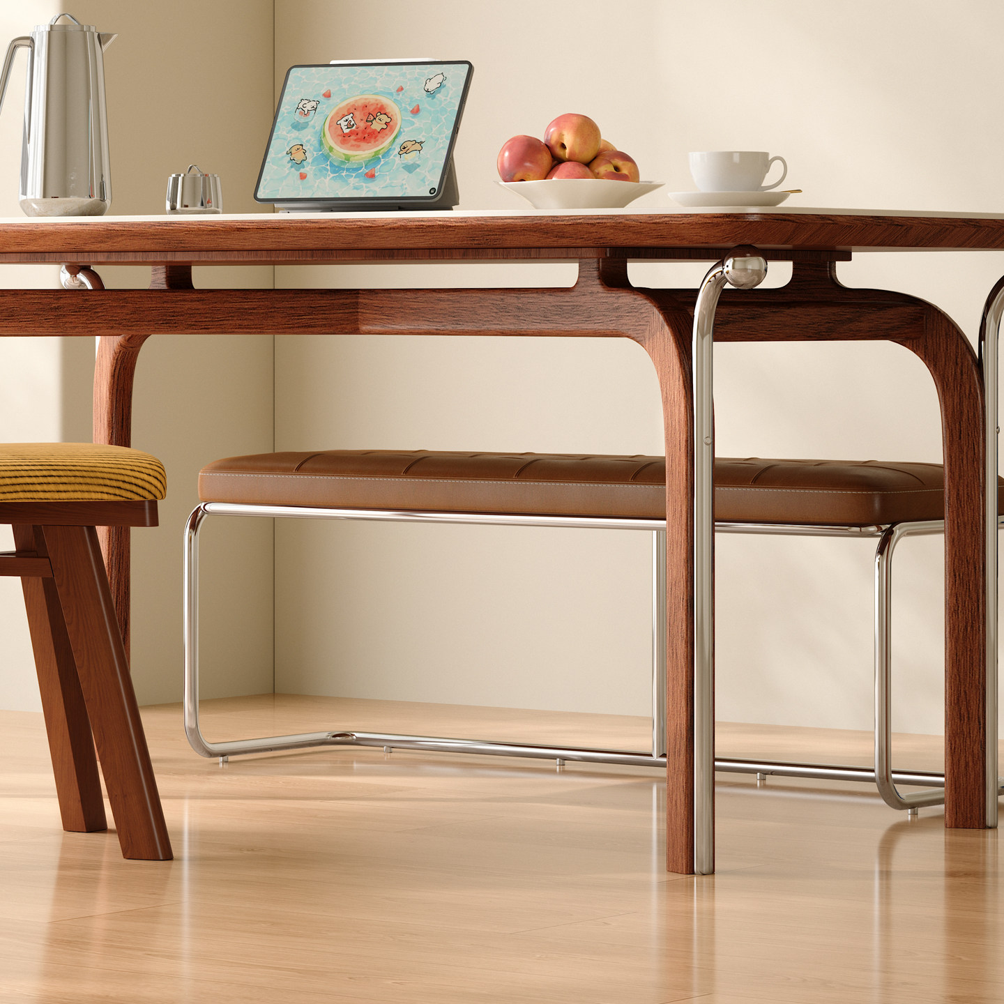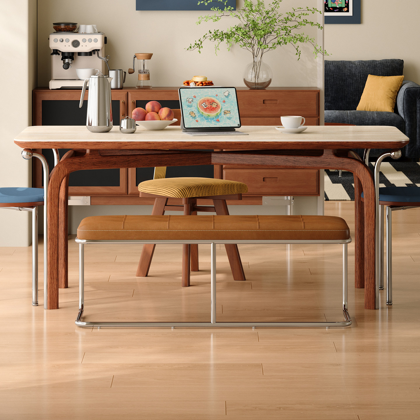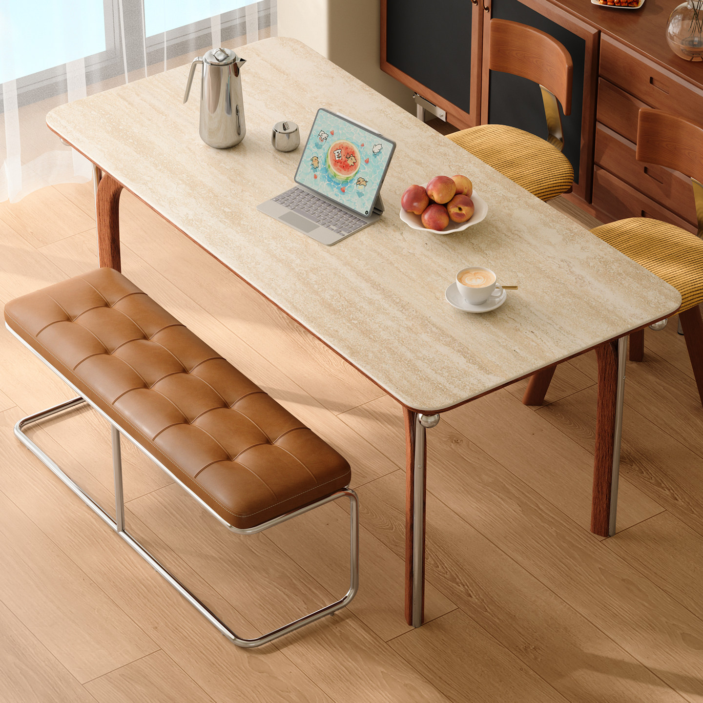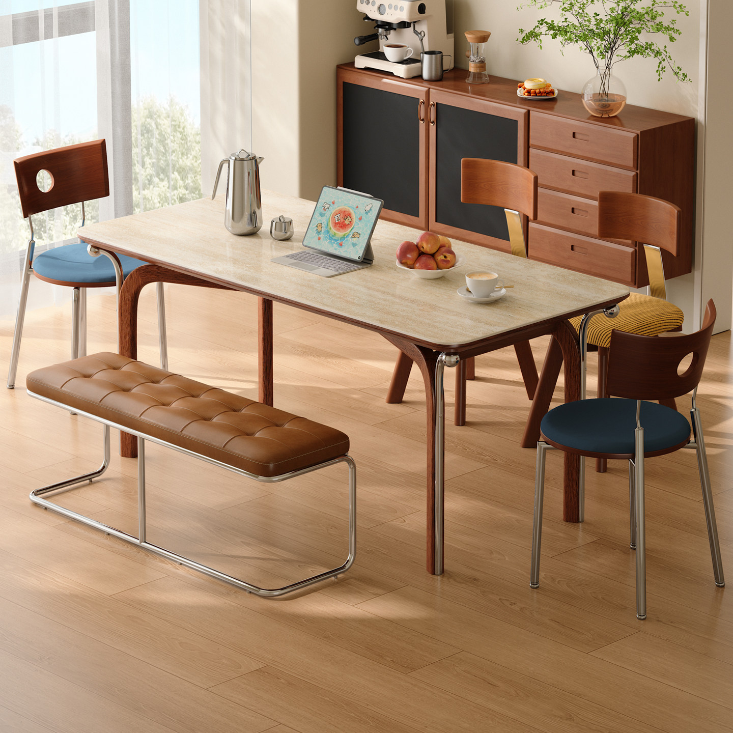 木小咖 豆芽实木岩板餐桌小户型长方形北欧复古中古餐桌椅组合