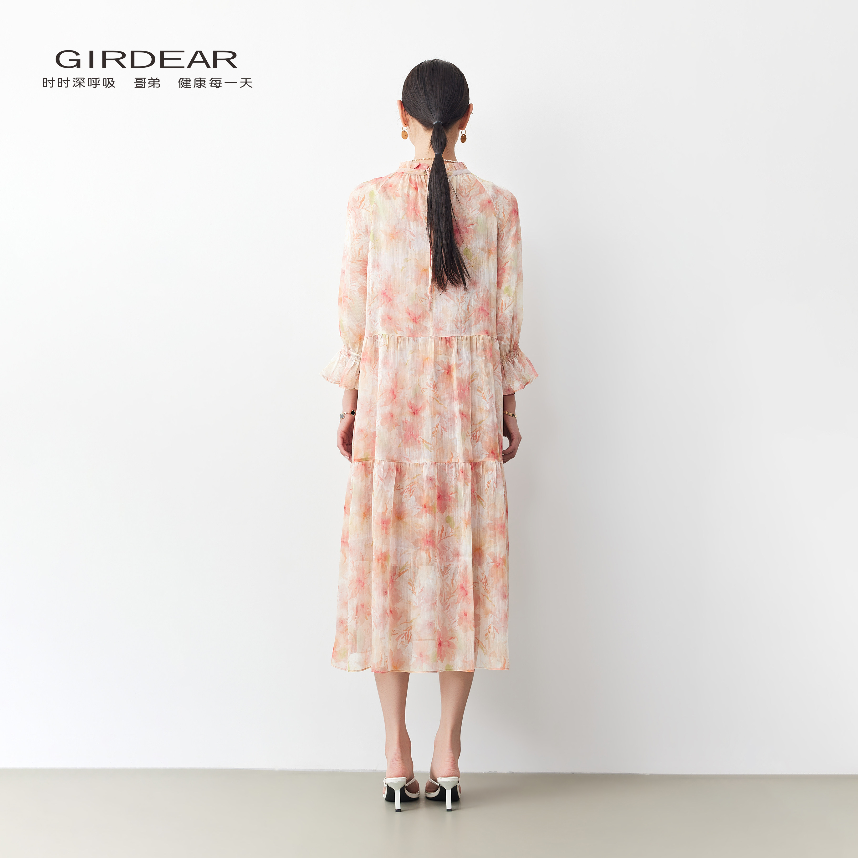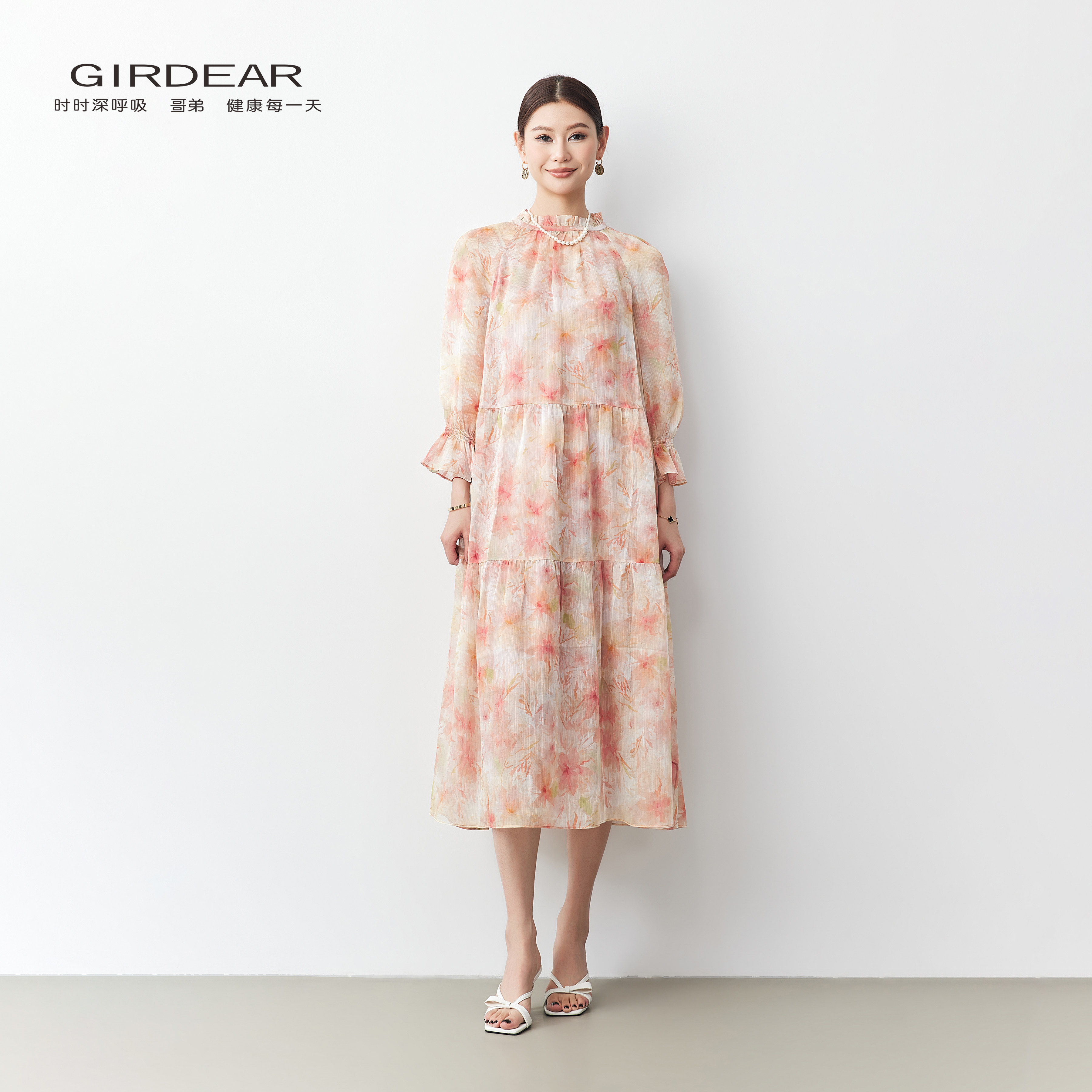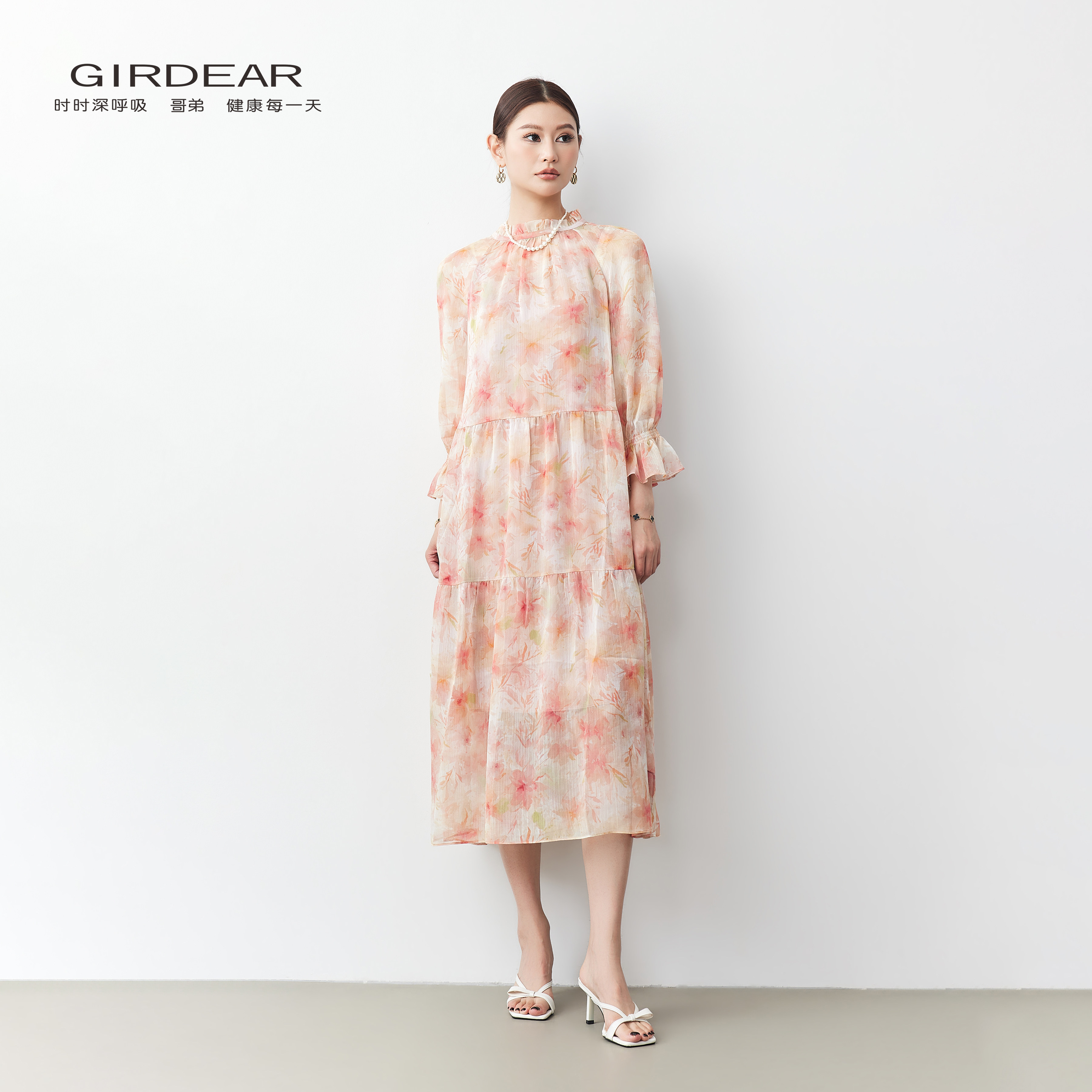 Girdear/哥弟法式浪漫风碎花女优雅木耳边飘逸假日感连衣裙150008