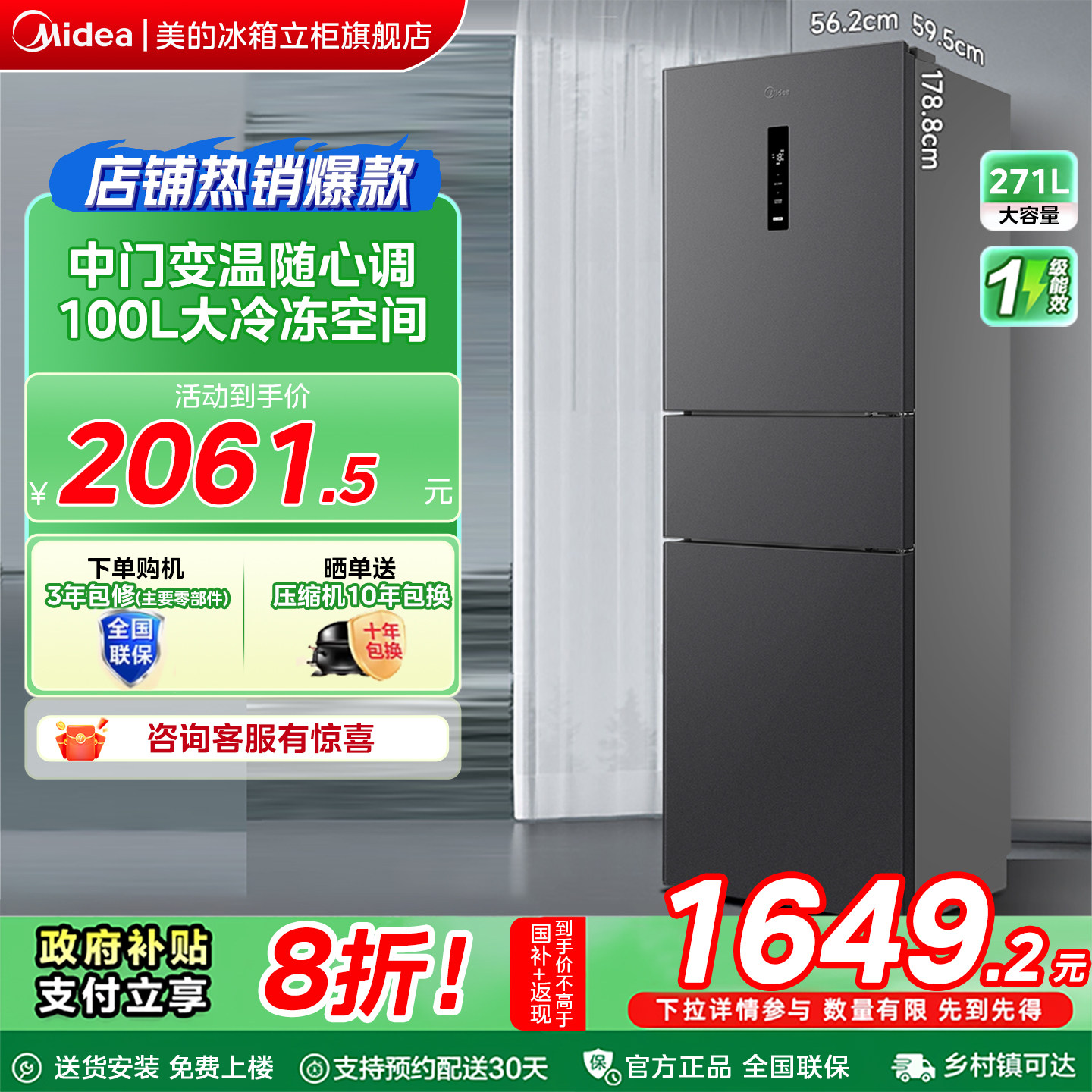 美的283三开门电冰箱一级能效家用变频风冷无霜小型超薄官方租房