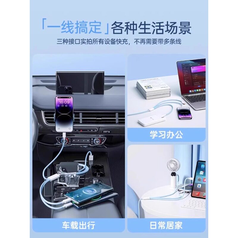 倍思数据线三合一充电线器一拖三快充三头适用多头车载苹果Typec充手机车超级车用汽车USB伸缩多功能多用电器