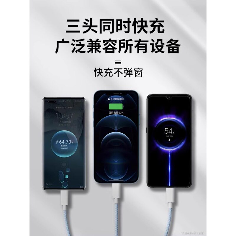 三合一120W超级充电器充电线快充一拖三数据线套装6A车载三用适用苹果华为小米vivotypec多